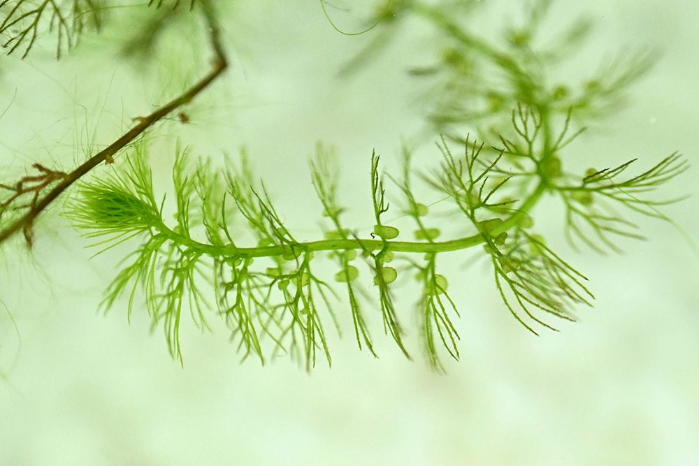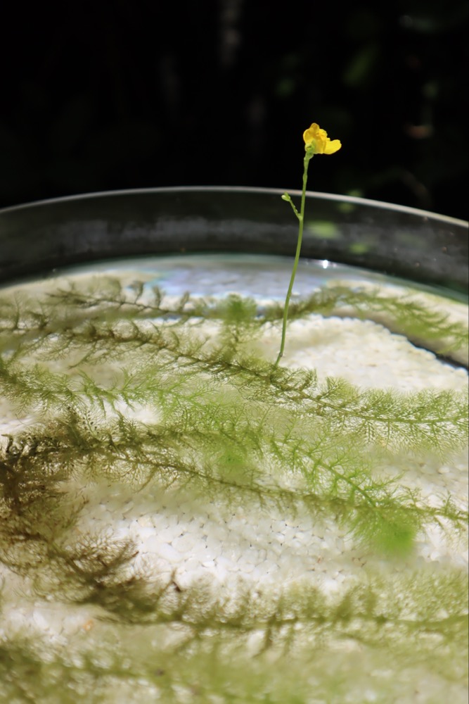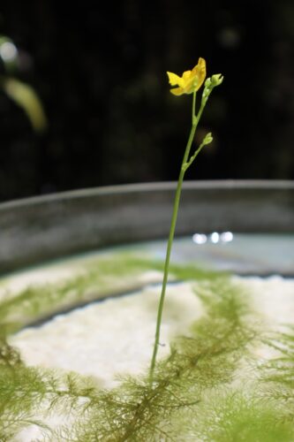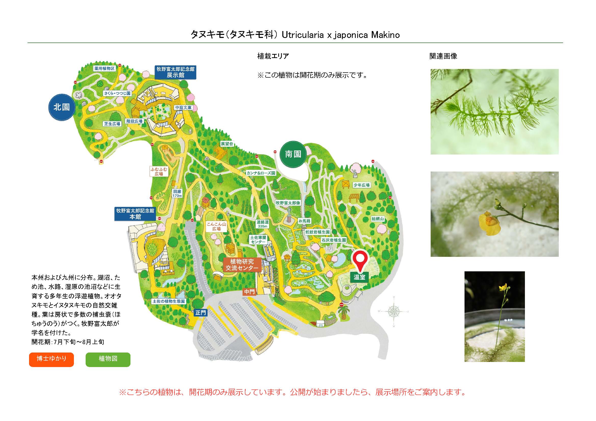 本州および九州に分布。湖沼、ため池、水路、湿原の池沼などに生育する多年生の浮遊植物。オオタヌキモとイヌタヌキモの自然交雑種。葉は房状で多数の捕虫嚢(ほちゅうのう)がつく。牧野富太郎が学名を付けた。 |