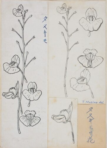 植物図は、牧野富太郎が1914(大正3)年にタヌキモを『植物学雑誌』28巻に発表した時の第3図版の原図。 |