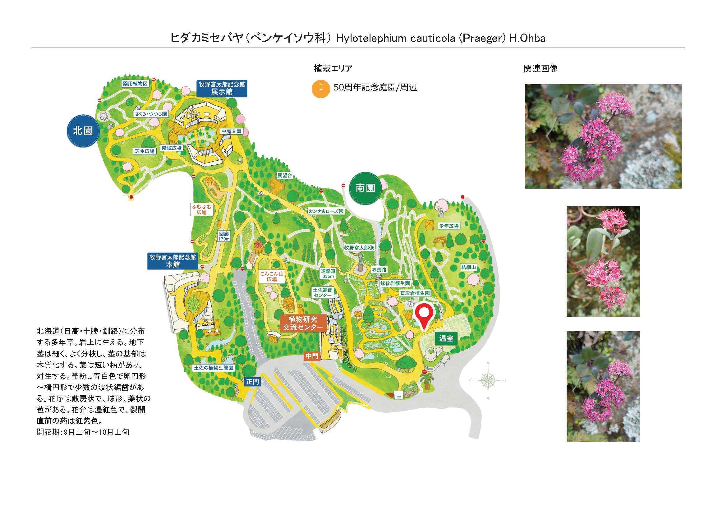 2025-02-27 / 最終更新日 : 2025-09-19 牧野植物園広報課管理 ヒダカミセバヤ(ベンケイソウ科) 種名ヒダカミセバヤ 科名ベンケイソウ科 別名- 学名Hylotelephium cauticola (Praeger) H.Ohba 摘要 北海道(日高・十勝・釧路)に分布する多年草。岩上に生える。地下茎は細く、よく分枝し、茎の基部は木質化する。葉は短い柄があり、対生する。帯粉し青白色で卵円形~楕円形で少数の波状鋸歯がある。花序は散房状で、球形、葉状の苞がある。花弁は濃紅色で、裂開直前の葯は紅紫色。 さらに詳しく① さらに詳しく② 植栽エリア I50周年記念庭園/周辺 開花期 9月上旬〜10月上旬 見ごろ 博士ゆかり 植物図 同じ科名の園内植物 エッチュウミセバヤ キリンソウ タイトゴメ ツメレンゲ ヒメキリンソウ マルバマンネングサ ヤハズマンネングサ