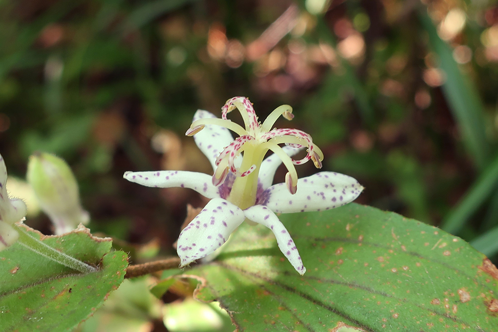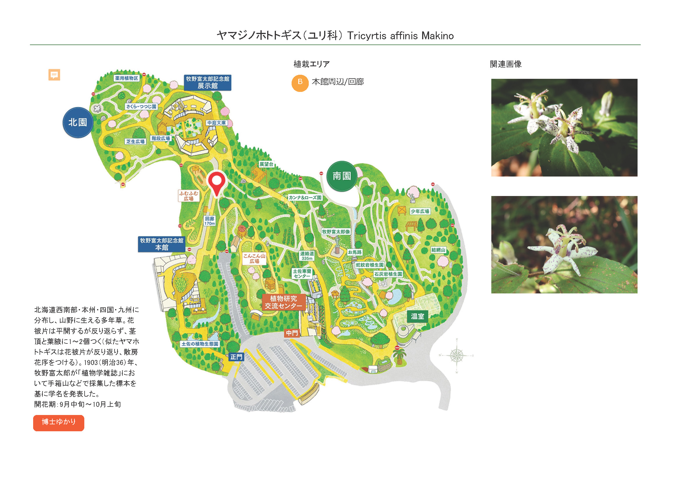 摘要 北海道西南部・本州・四国・九州に分布し、山野に生える多年草。花被片は平開するが反り返らず、茎頂と葉腋に1~2個つく(似たヤマホトトギスは花被片が反り返り、散房花序をつける)。1903(明治36)年、牧野富太郎が「植物学雑誌」において手箱山などで採集した標本を基に学名を発表した。