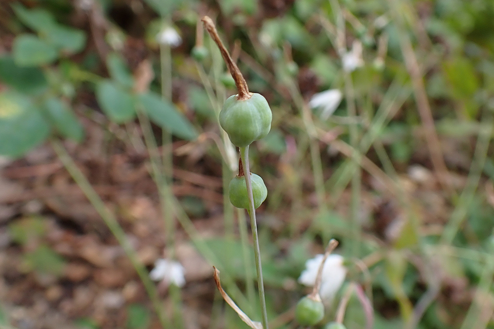 摘要 ポルトガル、モロッコからイオニア諸島に分布する多年草。鱗茎は小さく径約1.5cm。開花時には葉がなく、開花後に糸状の葉を出し、翌年5月ごろまで生育する。花茎は15~20cmで、径約1cmの白から淡い桃色の花を2~3個つける。