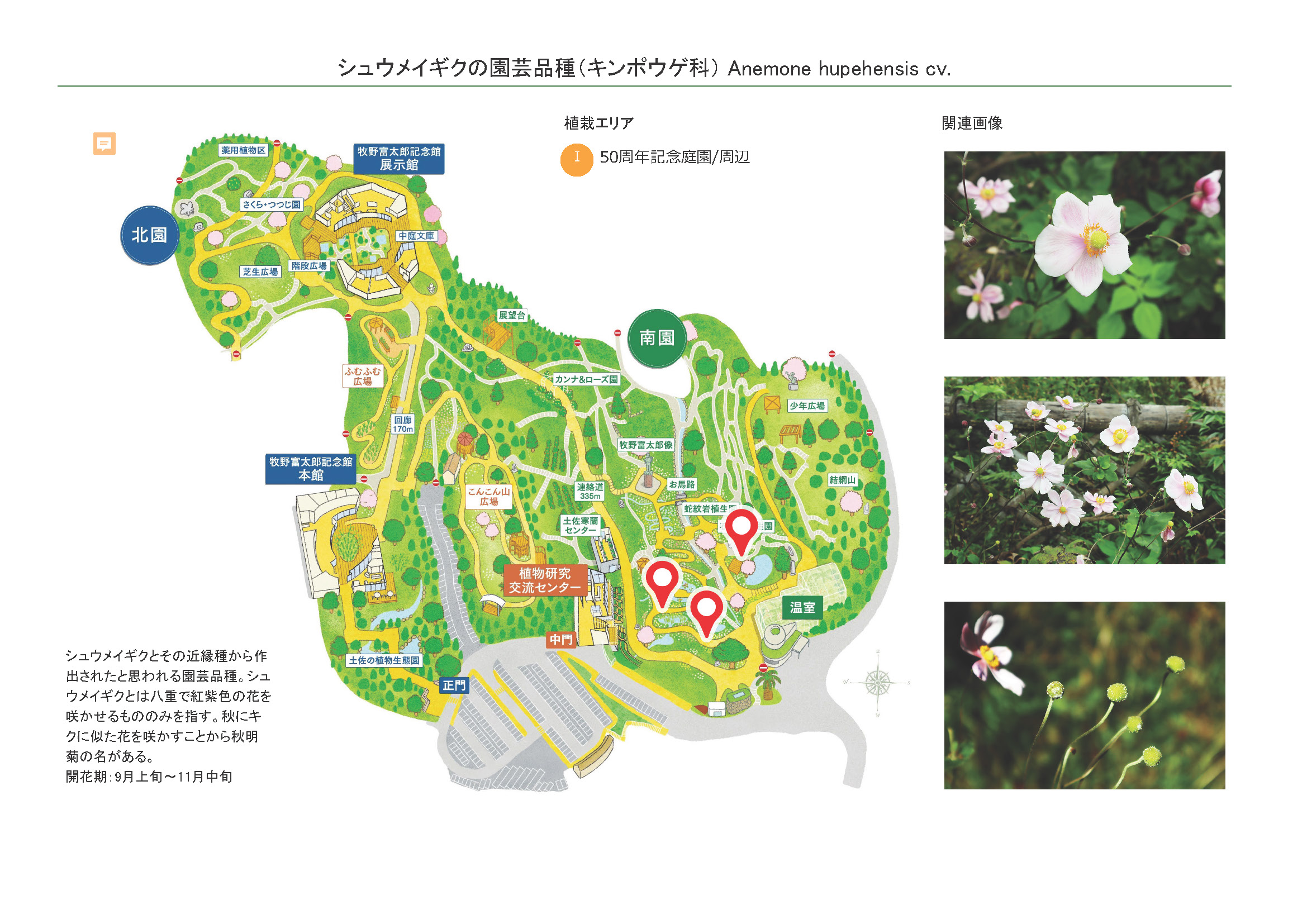 2026-01-14 / 最終更新日 : 2026-01-22 広報課 シュウメイギクの園芸品種(キンポウゲ科) 種名シュウメイギクの園芸品種 科名キンポウゲ科 別名- 学名Anemone hupehensis cv. 摘要 シュウメイギクとその近縁種から作出されたと思われる園芸品種。秋にキクに似た花を咲かせることから秋明菊の名がある。 さらに詳しく① さらに詳しく② 植栽エリア I50周年記念庭園/周辺 開花期 9月上旬〜11月中旬 見ごろ ○ 博士ゆかり 植物図 園内で見られる同じ科の植物 ウマノアシガタ オオクサボタン オオミスミソウの園芸品種 オオヤマオダマキ オキナグサ サラシナショウマ シギンカラマツ シロバナカザグルマ さらに表示