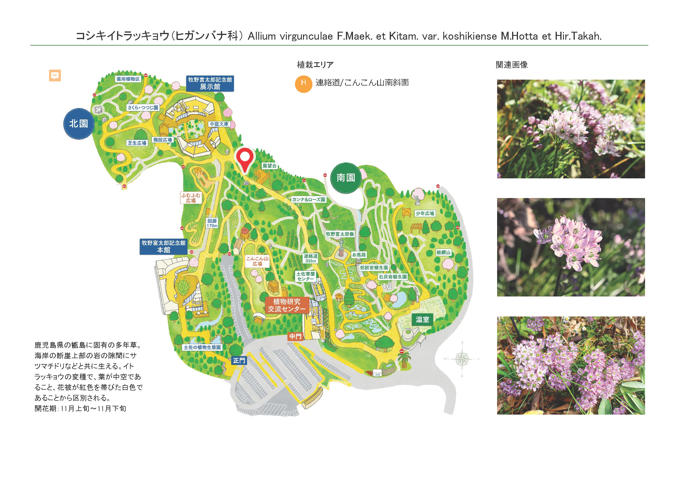 2026-01-14 / 最終更新日 : 2026-01-14 ガイドチーム コシキイトラッキョウ(ヒガンバナ科) 種名コシキイトラッキョウ 科名ヒガンバナ科 別名- 学名Allium virgunculae F.Maek. et Kitam. var. koshikiense M.Hotta et Hir.Takah. 摘要 鹿児島県の甑島列島に固有の多年草。海岸の断崖上部の岩の隙間にサツマチドリなどとともに生える。イトラッキョウの変種で、葉が中空であること、花被が紅色を帯びた白色であることから区別される。 さらに詳しく① さらに詳しく② 植栽エリア H連絡道/こんこん山南斜面 開花期 11月上旬〜11月下旬 見ごろ 博士ゆかり 植物図 園内で見られる同じ科の植物 アキザキスノーフレーク‘セプテンバースノー’ アサツキ イズアサツキ オオキツネノカミソリ キツネノカミソリ ササガニユリ ショウキズイセン シロスジアマリリス さらに表示