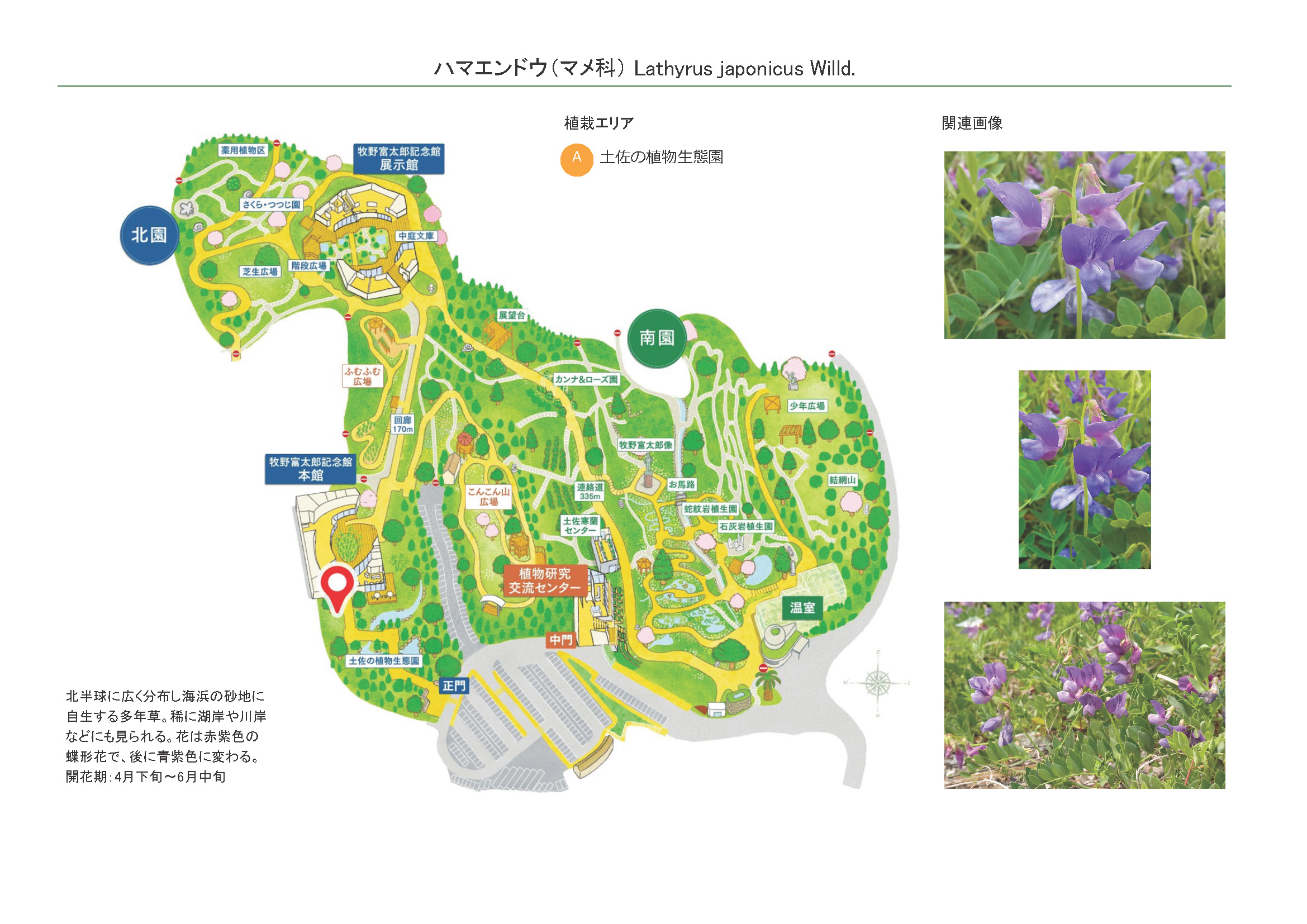 2026-01-15 / 最終更新日 : 2026-01-15 ガイドチーム ハマエンドウ(マメ科) 蝶花ははじめ赤紫色で後に青紫色に変わる 花は総状に3~6個つき、長さ約3cm 蝶花ははじめ赤紫色で後に青紫色に変わる 種名ハマエンドウ 科名マメ科 別名- 学名Lathyrus japonicus Willd. 摘要 北半球に広く分布し海浜の砂地に自生する多年草。稀に湖岸や川岸などにも見られる。花は赤紫色の蝶形花で、後に青紫色に変わる。 さらに詳しく① さらに詳しく② 植栽エリア A土佐の植物生態園 開花期 4月下旬〜6月中旬 見ごろ 博士ゆかり 植物図 園内で見られる同じ科の植物 アカシア・スペクタビリス アムヘルスティア・ノビリス イヌハギ ウンナンハギ エビスグサ オオベニゴウカン オジギソウ カワラケツメイ さらに表示