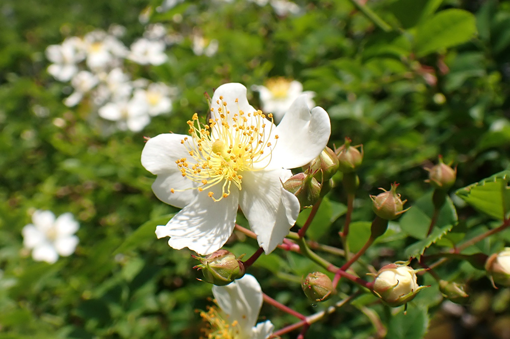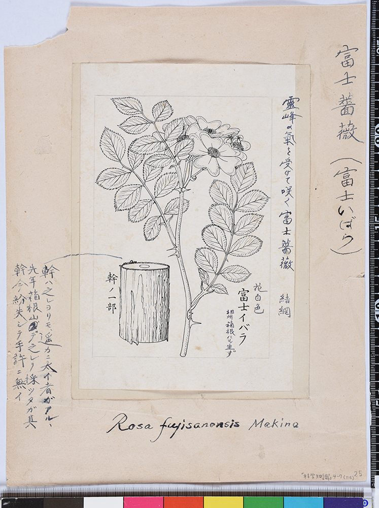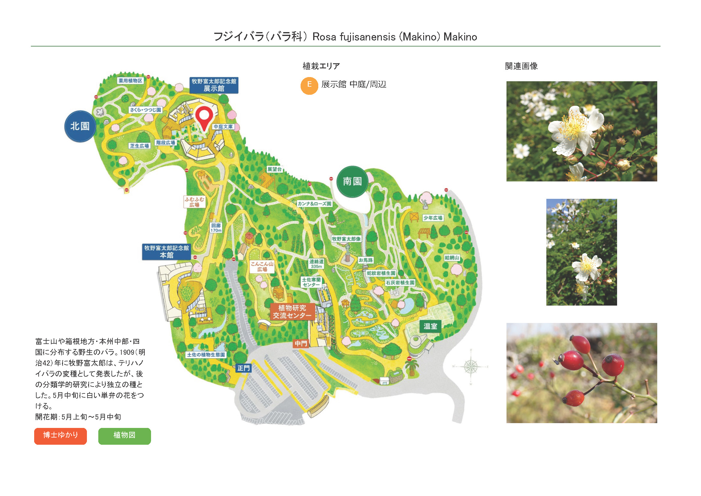 2026-01-15 / 最終更新日 : 2026-01-15 ガイドチーム フジイバラ(バラ科) 枝先に円錐花序をつけ白い花を咲かせる 花は径2.5cm 果実 描画者:牧野富太郎 材質:ケント紙 技法:墨 場所:相州箱根山(神奈川県箱根町) 出典:「科学知識」第4巻第7号(1924) 枝先に円錐花序をつけ白い花を咲かせる 種名フジイバラ 科名バラ科 別名- 学名Rosa fujisanensis (Makino) Makino 摘要 富士山や箱根地方・本州中部・四国に分布する野生のバラ。1909(明治42)年に牧野富太郎は、テリハノイバラの変種として発表したが、後の分類学的研究により独立の種とした。5月中旬に白い単弁の花をつける。 さらに詳しく① さらに詳しく② 植栽エリア E展示館 中庭/周辺 開花期 5月上旬〜5月中旬 見ごろ 博士ゆかり ○ 植物図 ○ 園内で見られる同じ科の植物 アメリカザイフリボク アンズ イザヨイバラ イヌリンゴ ‘アルプス乙女’ イワガサ ウメ ウメ‘呉服枝垂' ウメ‘鹿児島紅’ さらに表示