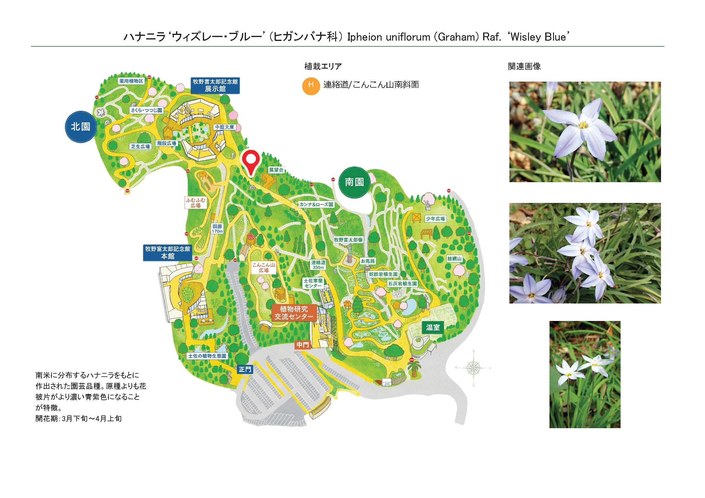 2026-01-28 / 最終更新日 : 2026-01-28 ガイドチーム ハナニラ‘ウィズレー・ブルー’(ヒガンバナ科) 種名ハナニラ‘ウィズレー・ブルー’ 科名ヒガンバナ科 別名- 学名Ipheion uniflorum (Graham) Raf.‘Wisley Blue’ 摘要 南米に分布するハナニラをもとに作出された園芸品種。原種よりも花被片がより濃い青紫色になることが特徴。 さらに詳しく① さらに詳しく② 植栽エリア H連絡道/こんこん山南斜面 開花期 3月下旬〜4月上旬 見ごろ 博士ゆかり 植物図 園内で見られる同じ科の植物 アキザキスノーフレーク‘セプテンバースノー’ アサツキ イズアサツキ オオキツネノカミソリ キツネノカミソリ コシキイトラッキョウ ササガニユリ ショウキズイセン さらに表示