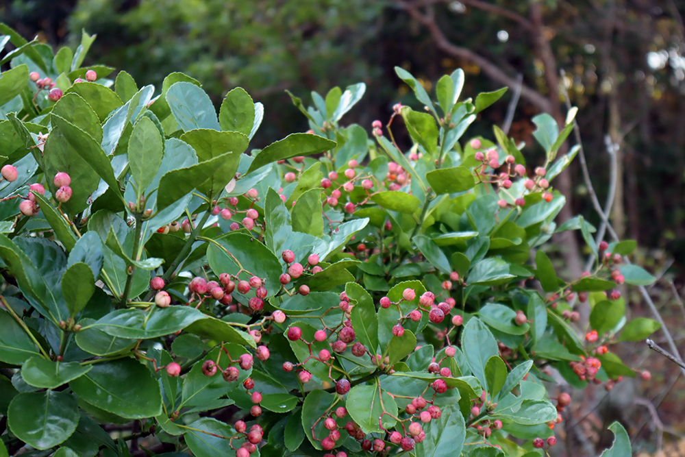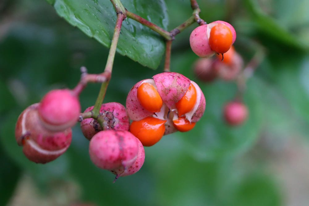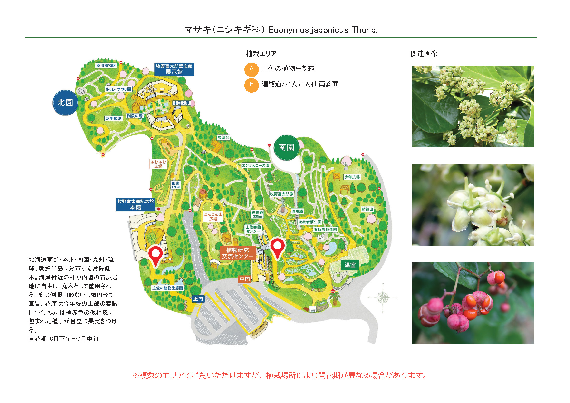 2026-01-28 / 最終更新日 : 2026-01-29 広報課 マサキ(ニシキギ科) 花 果実は球形で3~4裂し、橙赤色の仮種皮をもった種子を露出する 種名マサキ 科名ニシキギ科 別名- 学名Euonymus japonicus Thunb. 摘要 北海道南部・本州・四国・九州・琉球、朝鮮半島に分布する常緑低木。海岸付近の林や内陸の石灰岩地に自生し、庭木として重用される。葉は倒卵円形ないし楕円形で革質。花序は今年枝の上部の葉腋につく。秋には橙赤色の仮種皮に包まれた種子が目立つ果実をつける。 さらに詳しく① さらに詳しく② 植栽エリア A土佐の植物生態園 H連絡道/こんこん山南斜面 開花期 6月下旬〜7月中旬 見ごろ 博士ゆかり 植物図 園内で見られる同じ科の植物 ウメバチソウ オオコマユミ コマユミ ツルウメモドキ ニシキギ ヒゼンマユミ マユミ モクレイシ