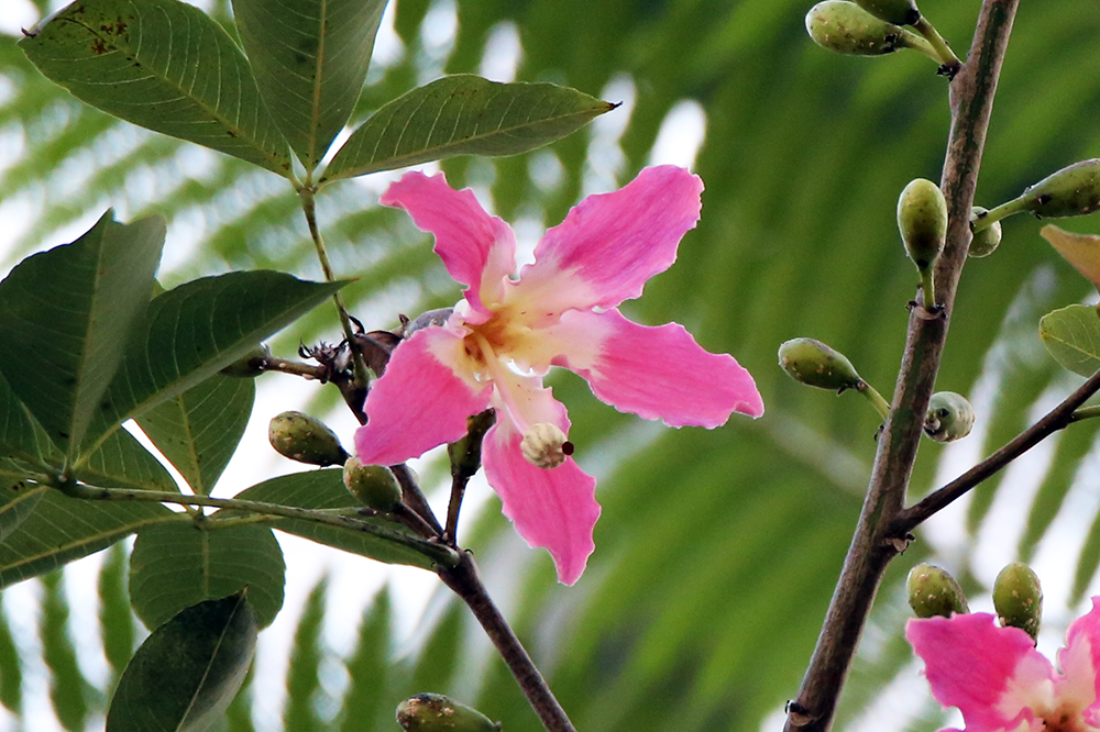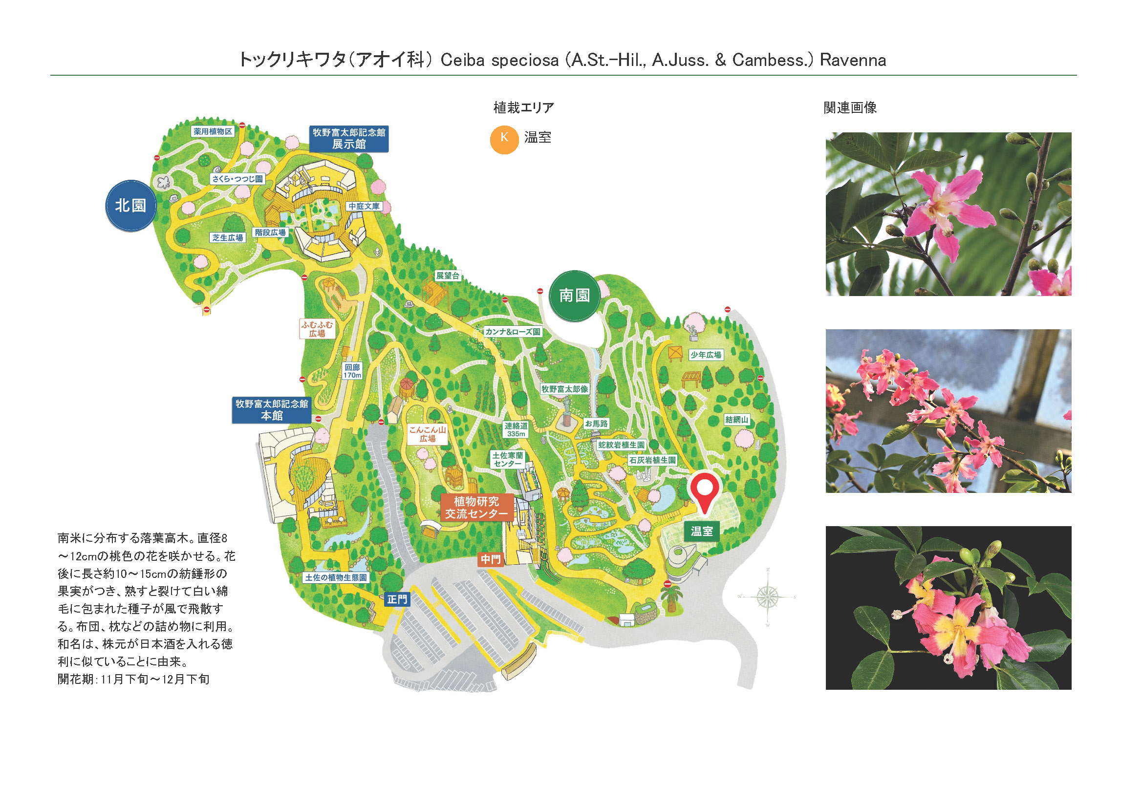 2026-01-28 / 最終更新日 : 2026-01-28 ガイドチーム トックリキワタ(アオイ科) 花 フォーカスシフト撮影 膨らんだ株元 幹には棘がある 種名トックリキワタ 科名アオイ科 別名- 学名Ceiba speciosa (A.St.-Hil., A.Juss. & Cambess.) Ravenna 摘要 南米に分布する落葉高木。直径8~12cmの桃色の花を咲かせる。花後に長さ約10~15cmの紡錘形の果実がつき、熟すと裂けて白い綿毛に包まれた種子が風で飛散する。布団、枕などの詰め物に利用。和名は、株元が日本酒を入れる徳利に似ていることに由来。 さらに詳しく① さらに詳しく② 植栽エリア K温室 開花期 11月下旬〜12月下旬 見ごろ 博士ゆかり 植物図 園内で見られる同じ科の植物 アオギリ ウスベニタチアオイ カカオ カラスノゴマ サキシマフヨウ ザーバオバブ シナノキ スイフヨウ さらに表示
