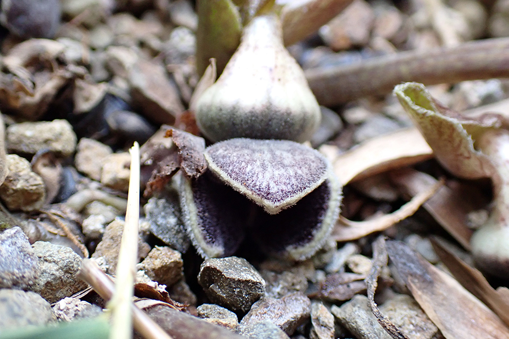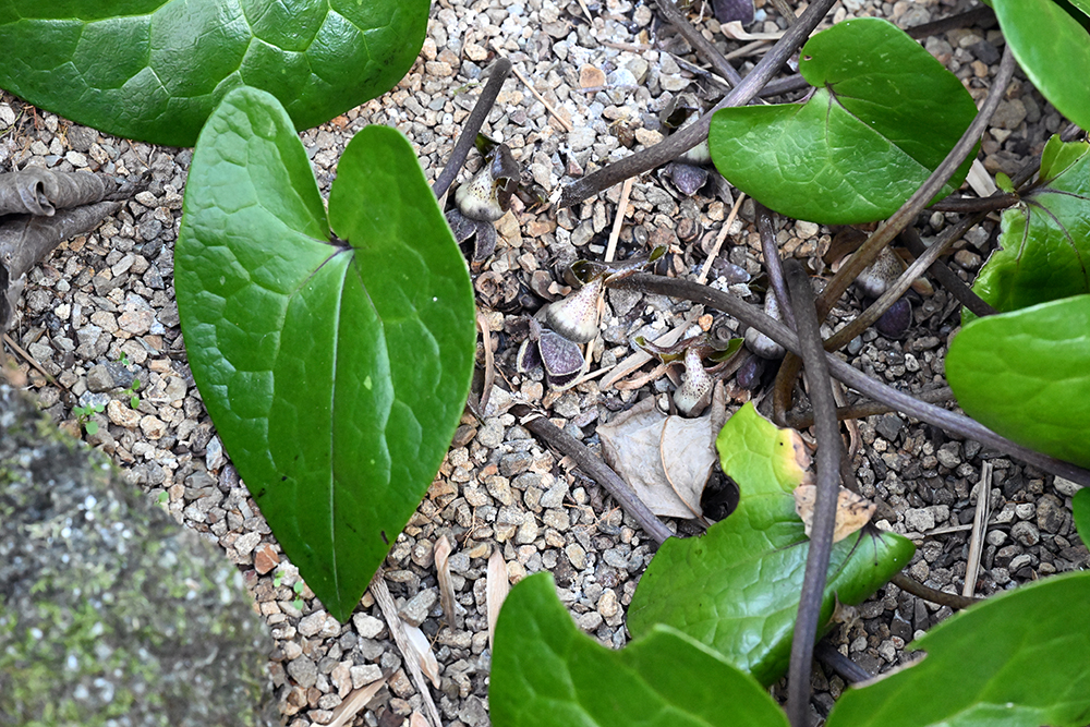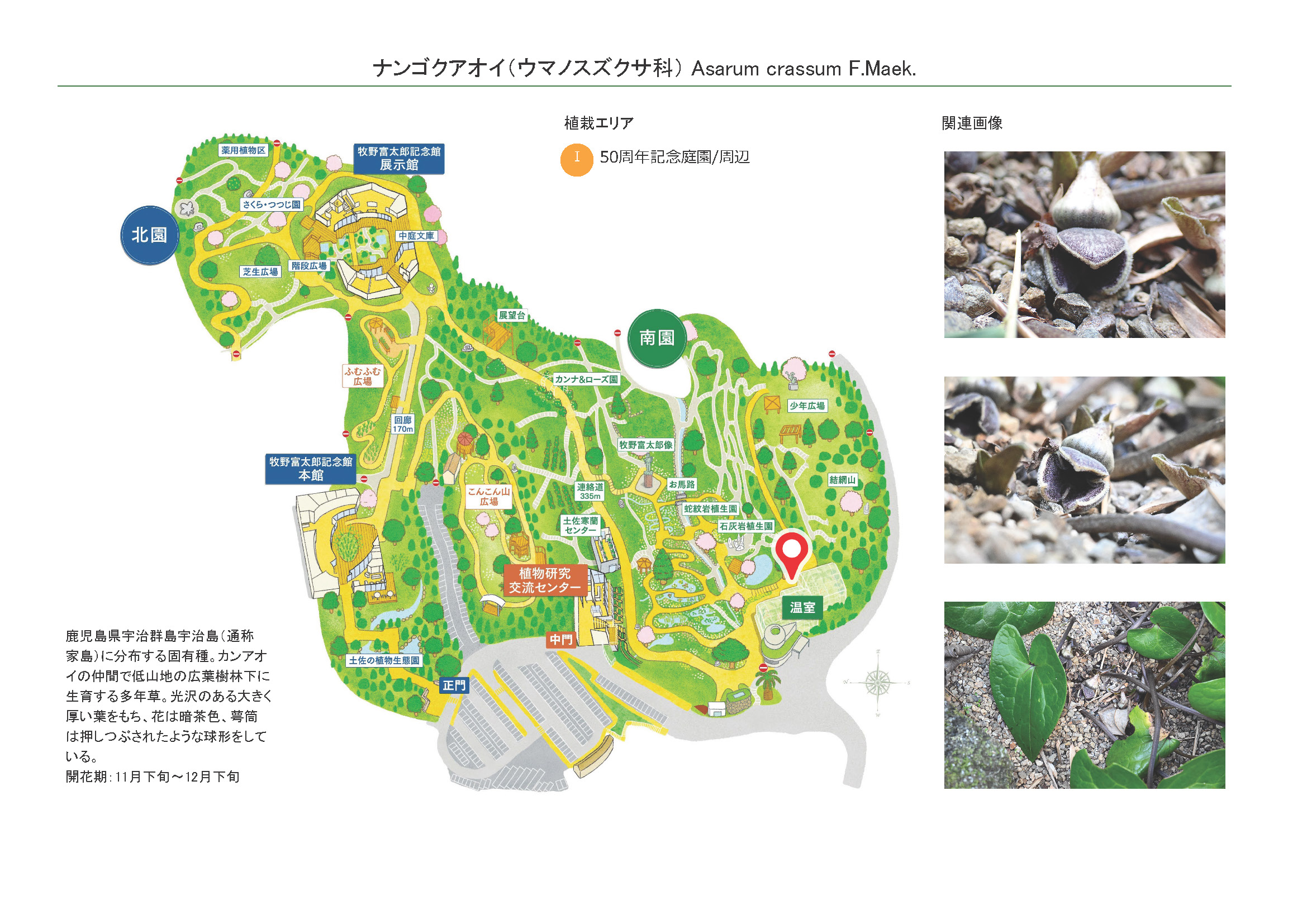 2026-01-28 / 最終更新日 : 2026-01-28 ガイドチーム ナンゴクアオイ(ウマノスズクサ科) 花 萼は多肉質で3裂する 葉 花 種名ナンゴクアオイ 科名ウマノスズクサ科 別名- 学名Asarum crassum F.Maek. 摘要 鹿児島県宇治群島宇治島(通称 家島)に分布する固有種。カンアオイの仲間で低山地の広葉樹林下に生育する多年草。光沢のある大きく厚い葉をもち、花は暗茶色、萼筒は押しつぶされたような球形をしている。 さらに詳しく① さらに詳しく② 植栽エリア I50周年記念庭園/周辺 開花期 11月下旬〜12月下旬 見ごろ 博士ゆかり 植物図 園内で見られる同じ科の植物 アリストロキア・ギガンテア アリストロキア・サルヴァドレンシス アリストロキア・トリカウダタ アリマウマノスズクサ ウマノスズクサ オオバウマノスズクサ サカワサイシン ミヤコアオイ