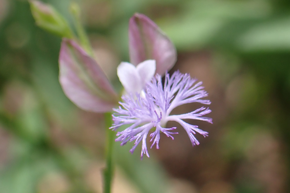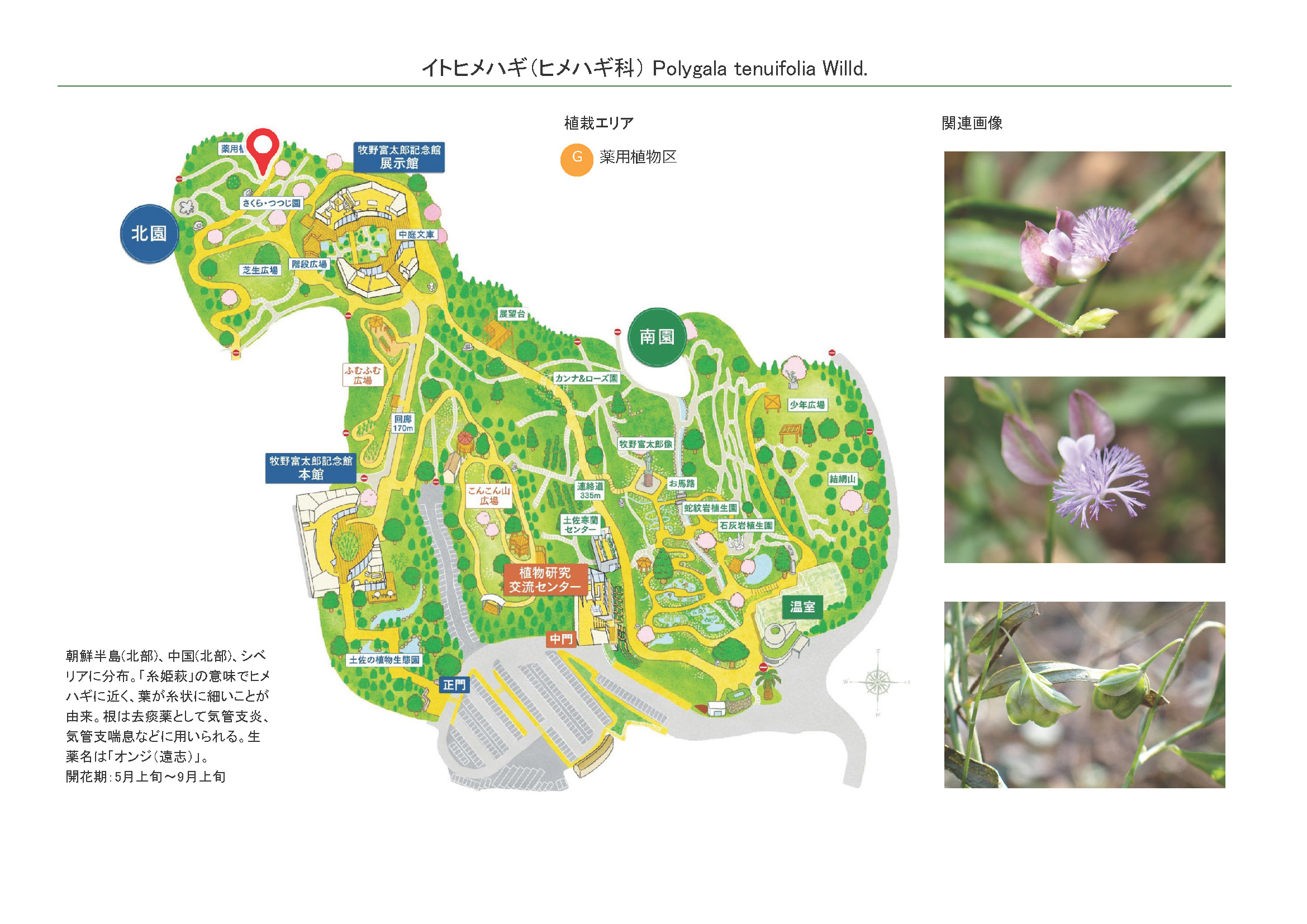 2026-02-13 / 最終更新日 : 2026-02-13 ガイドチーム イトヒメハギ(ヒメハギ科) 総状花序を出しまばらに紅紫色の花をつける さく果は長さ約4~5㎜ 種名イトヒメハギ 科名ヒメハギ科 別名オンジ, ホソバヒメハギ 学名Polygala tenuifolia Willd. 摘要 朝鮮半島、中国、シベリアに分布。乾燥した草原や山肌が露出した斜面などに生育する多年草。和名は葉が糸状に細いヒメハギの仲間であることから。根は去痰薬として気管支炎、気管支喘息などに用いられる。生薬名は「オンジ(遠志)」。 さらに詳しく① さらに詳しく② 植栽エリア G薬用植物区 開花期 5月上旬〜9月上旬 見ごろ 博士ゆかり 植物図