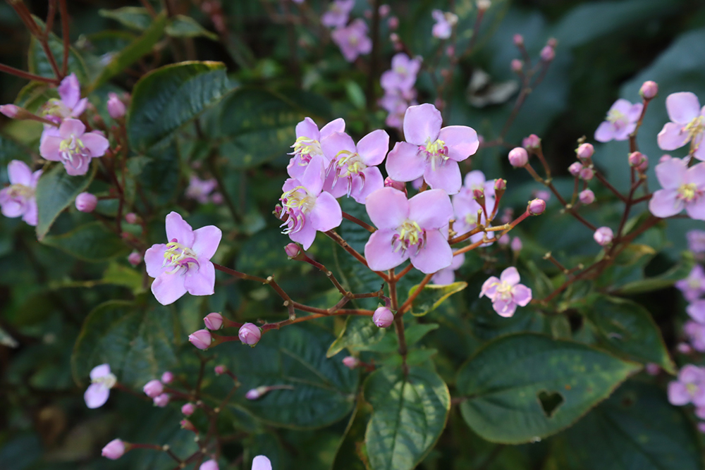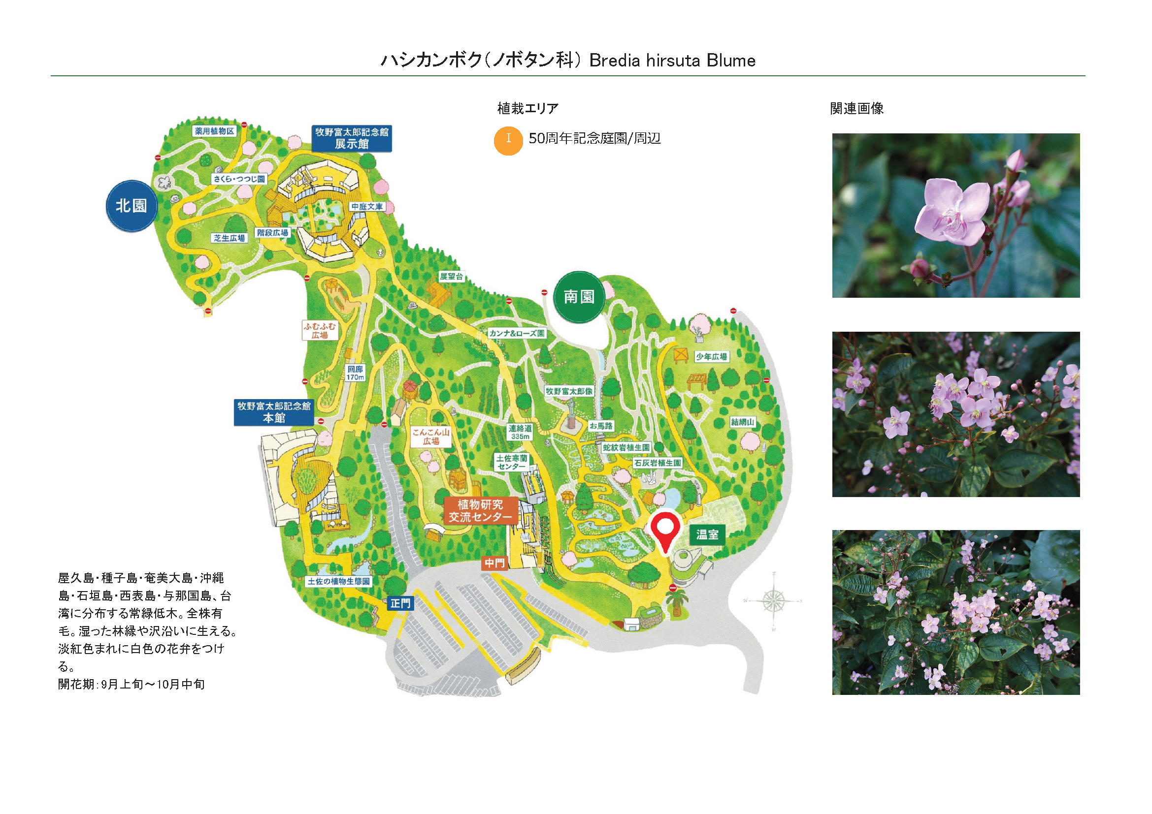 2026-02-13 / 最終更新日 : 2026-02-13 ガイドチーム ハシカンボク(ノボタン科) 種名ハシカンボク 科名ノボタン科 別名ハシカン 学名Bredia hirsuta Blume 摘要 屋久島・種子島・奄美大島・沖縄島・石垣島・西表島・与那国島、台湾に分布する常緑低木。湿った林縁や沢沿いに生える。淡紅色まれに白色の花弁をつける。 さらに詳しく① さらに詳しく② 植栽エリア I50周年記念庭園/周辺 開花期 9月上旬〜10月中旬 見ごろ 博士ゆかり 植物図 園内で見られる同じ科の植物 シコンノボタン‘リトルエンジェル’ ハシカンボク(白花) ヒメノボタン メディニラ・スペキオサ メディニラ・マグニフィカ