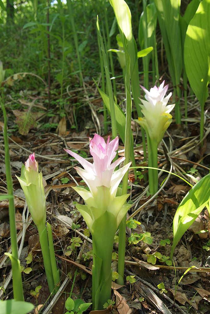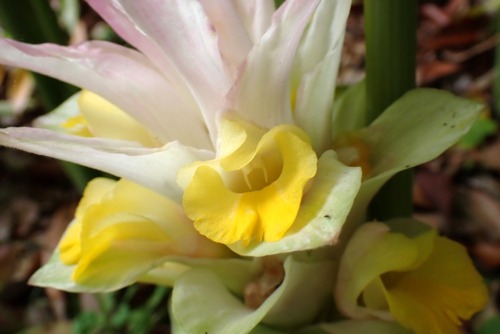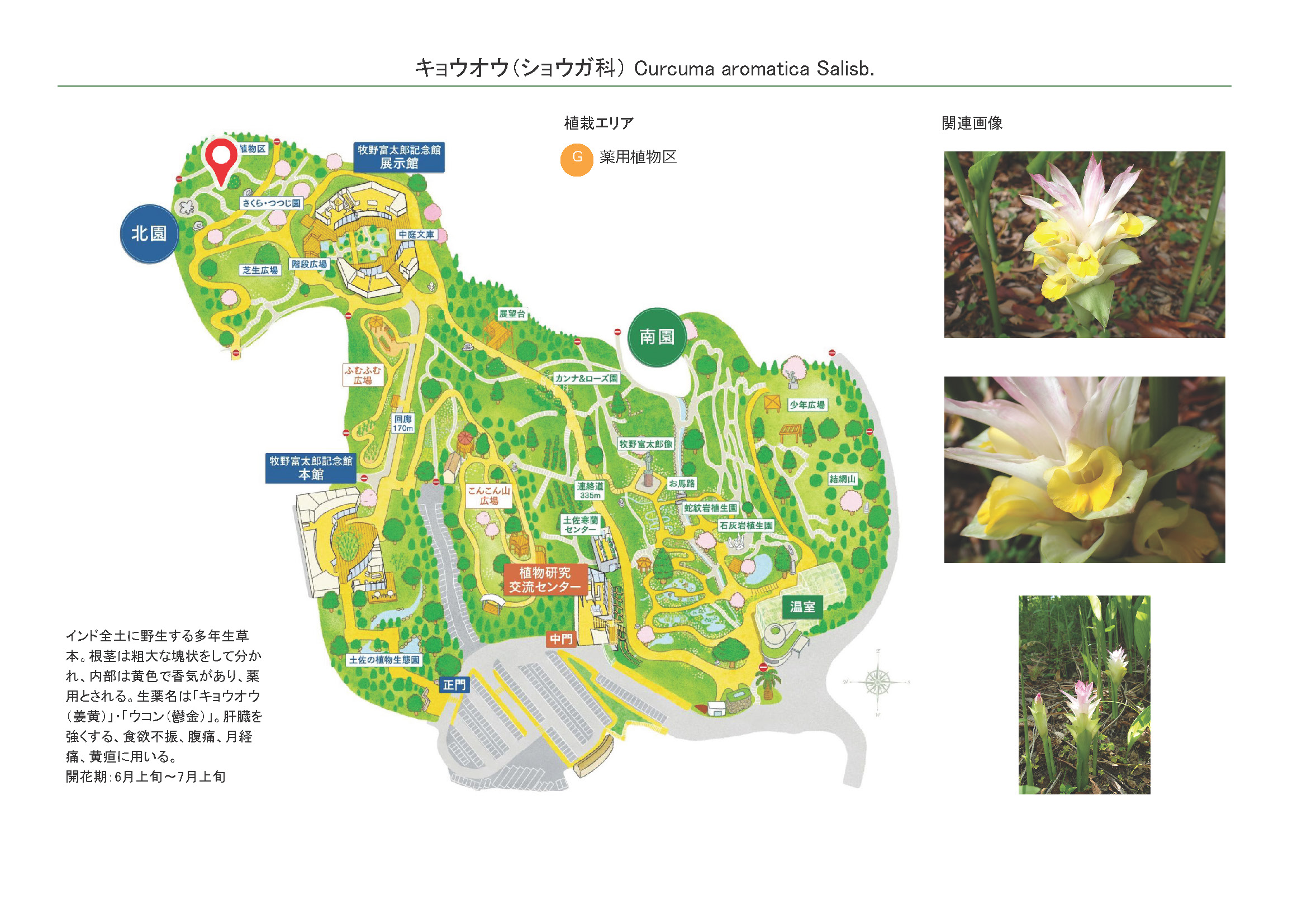 2026-02-13 / 最終更新日 : 2026-02-13 ガイドチーム キョウオウ(ショウガ科) 苞葉の上部はそり返り頂部は紅色 花は苞葉の腋につく 花茎の高さは約30㎝ 苞葉の上部はそり返り頂部は紅色 種名キョウオウ 科名ショウガ科 別名ハルウコン 学名Curcuma aromatica Salisb. 摘要 インド全土に分布する多年生草本。根茎は肥厚し塊状、内部は黄色で香気があり、薬用とされる。生薬名は「キョウオウ(姜黄)」・「ウコン(鬱金)」。食欲不振、腹痛、月経痛、黄疸に用いる。 さらに詳しく① さらに詳しく② 植栽エリア G薬用植物区 開花期 6月上旬〜7月上旬 見ごろ 博士ゆかり 植物図 園内で見られる同じ科の植物 アオノクマタケラン ウコン オオヤマショウガ ガジュツ ハナショウガ ミョウガの栽培品種