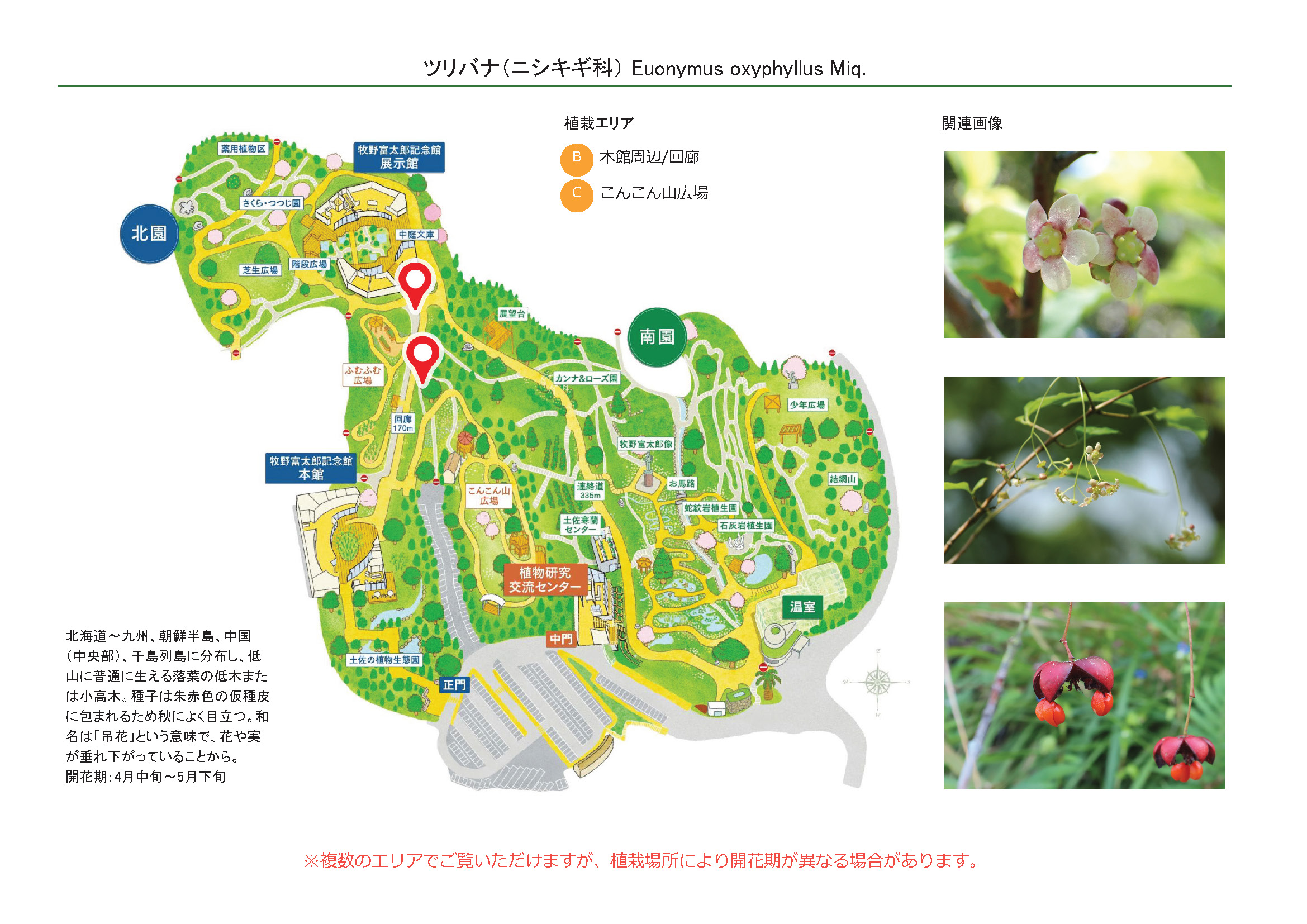 2026-03-02 / 最終更新日 : 2026-03-02 ガイドチーム ツリバナ(ニシキギ科) 花を下から見上げたようす 集散花序を花序を出し細長い枝を分枝し花を吊り下げる さく果は熟すと5裂し朱赤色の仮種皮を持った種子を露出する 花を下から見上げたようす 種名ツリバナ 科名ニシキギ科 別名タンザワツリバナ 学名Euonymus oxyphyllus Miq. 摘要 北海道~九州、千島列島、朝鮮半島、中国(中央部)に分布し、低山に普通に生える落葉の低木または小高木。種子は朱赤色の仮種皮に包まれるため秋によく目立つ。和名は「吊花」という意味で、花や果実が垂れ下がっていることから。 さらに詳しく① さらに詳しく② 植栽エリア B本館周辺/回廊 Cこんこん山広場 開花期 4月中旬〜5月下旬 見ごろ 博士ゆかり 植物図 園内で見られる同じ科の植物 ウメバチソウ オオコマユミ コマユミ ツルウメモドキ ニシキギ ヒゼンマユミ マサキ マユミ さらに表示