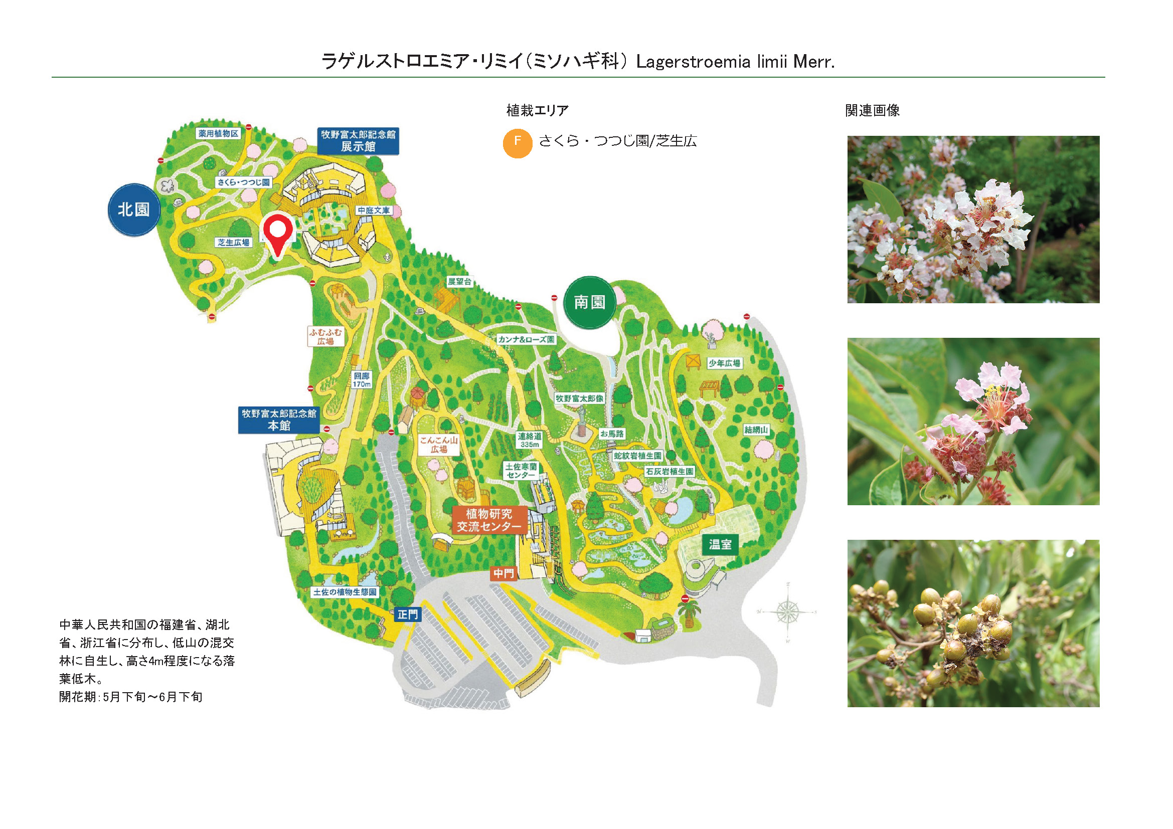 2026-03-02 / 最終更新日 : 2026-03-02 ガイドチーム ラゲルストロエミア・リミイ(ミソハギ科) 花 未熟な果実 果実は熟すと裂開する 花 種名ラゲルストロエミア・リミイ 科名ミソハギ科 別名- 学名Lagerstroemia limii Merr. 摘要 中国(福建省・湖北省・浙江省)に分布。低山の混交林に自生し、高さ4m程度になる落葉低木。 さらに詳しく① さらに詳しく② 植栽エリア Fさくら・つつじ園/芝生広場周辺 開花期 5月下旬〜6月下旬 見ごろ 博士ゆかり 植物図 園内で見られる同じ科の植物 サルスベリ シマサルスベリ ヒシ ミソハギ