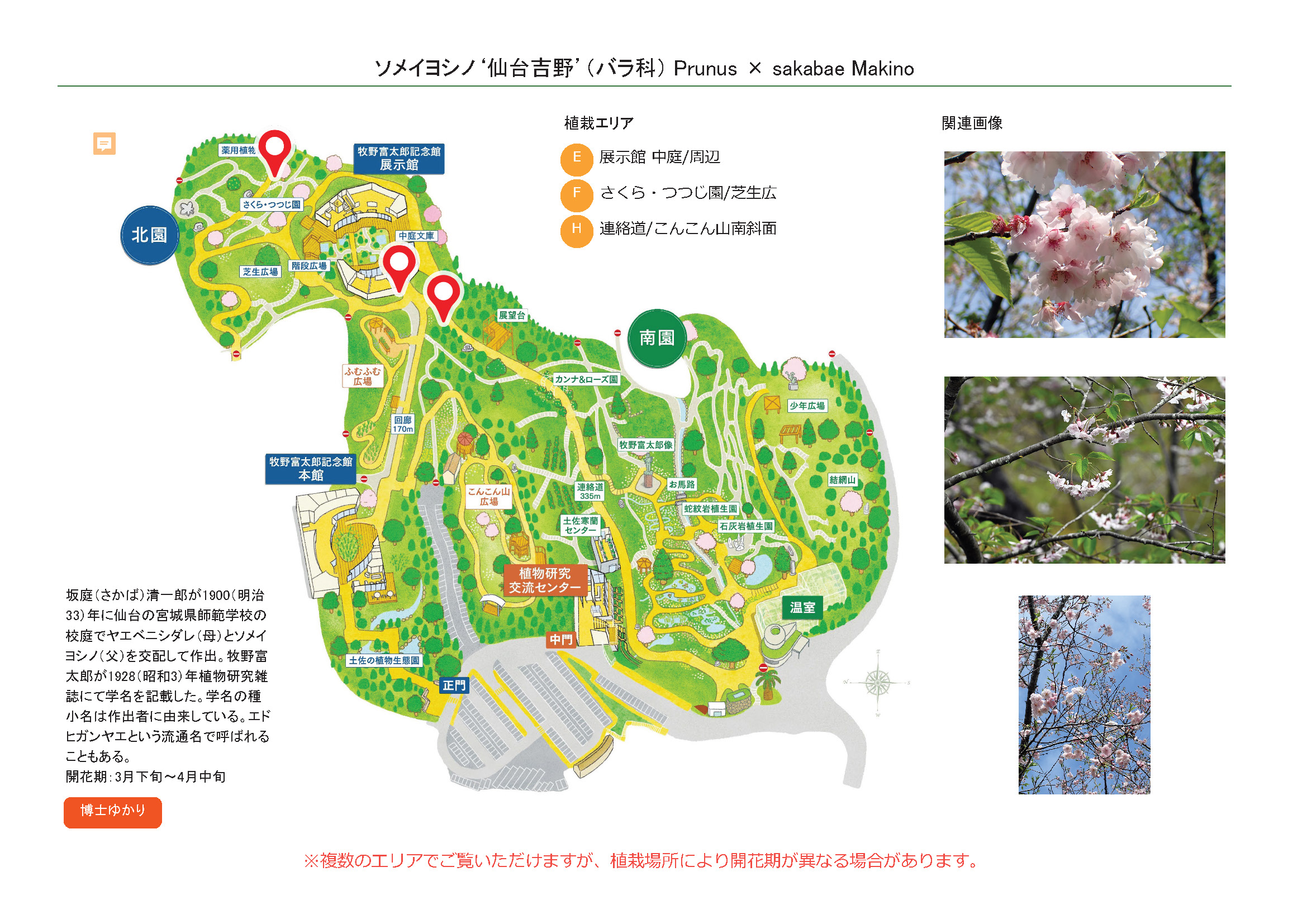 | 植栽エリア | E展示館 中庭/周辺 Fさくら・つつじ園/芝生広場周辺 H連絡道/こんこん山南斜面 |