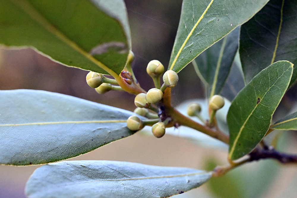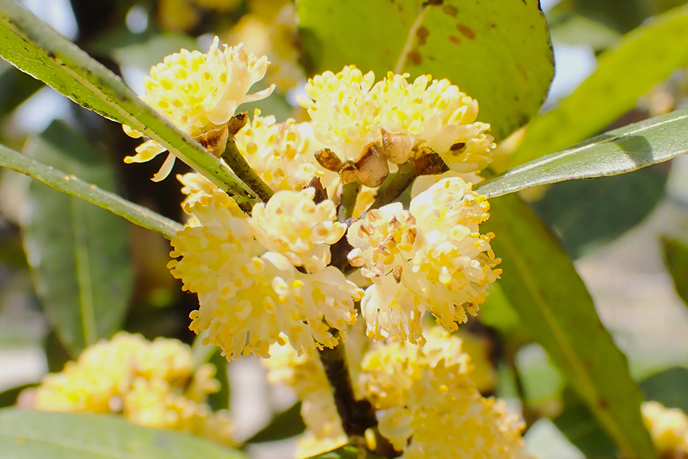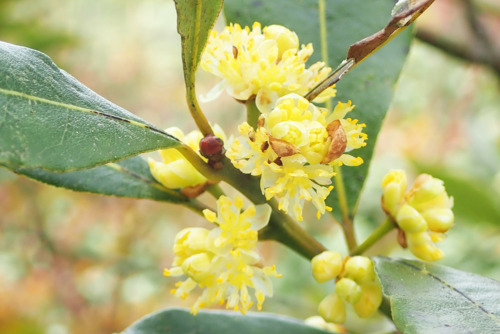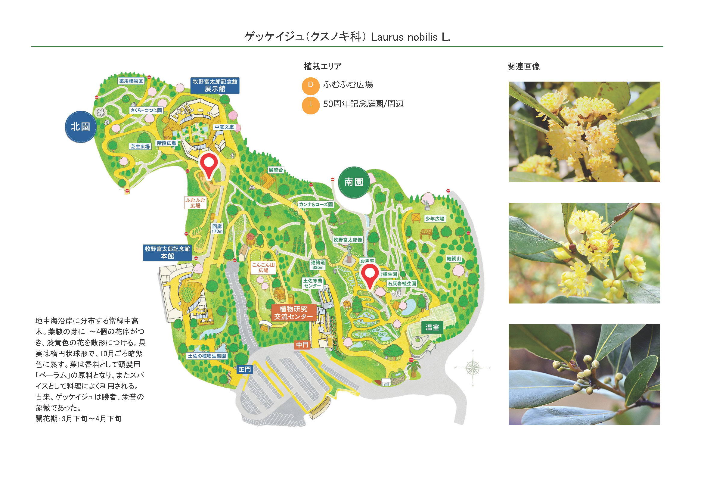 2026-03-23 / 最終更新日 : 2026-04-09 ガイドチーム ゲッケイジュ(クスノキ科) 花は散形に数個つく つぼみは総苞片に包まれ球形 葉は革質、傷つけると一種の香気がある 種名ゲッケイジュ 科名クスノキ科 別名ローレル 学名Laurus nobilis L. 摘要 地中海沿岸に分布する常緑中高木。葉腋の芽に1~4個の花序がつき、淡黄色の花を散形につける。果実は楕円状球形で、10月ごろ暗紫色に熟す。葉は香料として頭髪用「ベーラム」の原料となり、またスパイスとして料理によく利用される。古来、ゲッケイジュは勝者、栄誉の象徴であった。 さらに詳しく① さらに詳しく② 植栽エリア Dふむふむ広場 I50周年記念庭園/周辺 開花期 3月下旬〜4月下旬 見ごろ 博士ゆかり 植物図 園内で見られる同じ科の植物 アブラチャン シロダモ テンダイウヤク ホウショウ ヤマコウバシ
