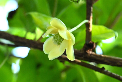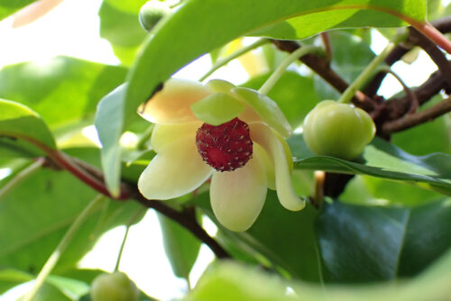 雄花。黄白色の花被片を持つ。おしべが多数集まって赤色の球状をしている。葯は赤色。