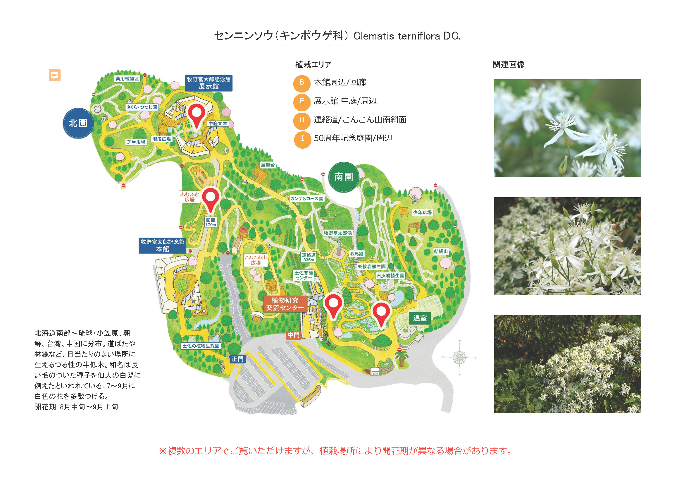 2024-09-04 / 最終更新日 : 2026-01-29 広報課 8月 センニンソウ(キンポウゲ科) 萼片は4個で十字形に平開、花弁状となる(花弁はない) 茎頂または葉腋に集散花序を出し、多数の白花が群がってつく 長い毛のついた種子を仙人の白髪のよう 萼片は4個で十字形に平開、花弁状となる(花弁はない) 種名センニンソウ 科名キンポウゲ科 別名- 学名Clematis terniflora DC. 摘要 北海道南部~琉球・小笠原、朝鮮、台湾、中国に分布。道ばたや林縁など、日当たりのよい場所に生えるつる性の半低木。和名は長い毛のついた種子を仙人の白髪に例えたといわれている。7~9月に白色の花を多数つける。 さらに詳しく① さらに詳しく② 植栽エリア B本館周辺/回廊 E展示館 中庭/周辺 H連絡道/こんこん山南斜面 I50周年記念庭園/周辺 開花期 8月中旬〜9月上旬 見ごろ ○ 博士ゆかり 植物図 園内で見られる同じ科の植物 ウマノアシガタ オオクサボタン オオミスミソウの園芸品種 オオヤマオダマキ オキナグサ サラシナショウマ シギンカラマツ シュウメイギクの園芸品種 さらに表示