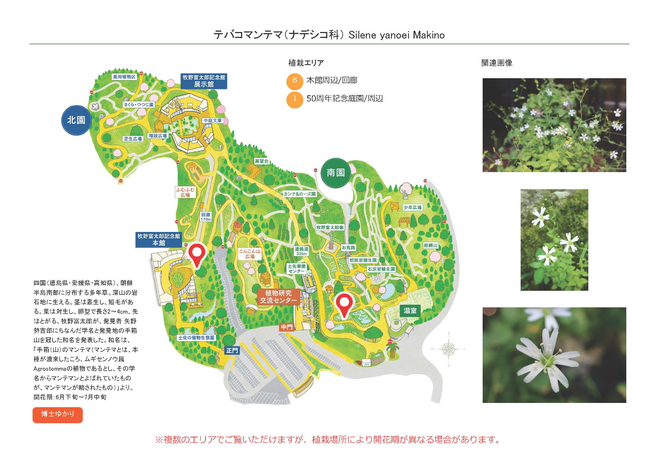 | 摘要 | 四国(徳島県・愛媛県・高知県)、朝鮮半島南部に分布する多年草。深山の岩石地に生える。茎は叢生し、短毛がある。葉は対生し、卵型で長さ2~4cm、先はとがる。牧野富太郎が、発見者 矢野勢吉郎にちなんだ学名と発見地の手箱山を冠した和名を発表した。和名は、「手箱(山)のマンテマ(マンテマとは、本種が渡来したころ、ムギセンノウ属Agrostemmaの植物であるとし、その学名からマンテマンとよばれていたものが、マンテマンが略されたもの)」より。 |