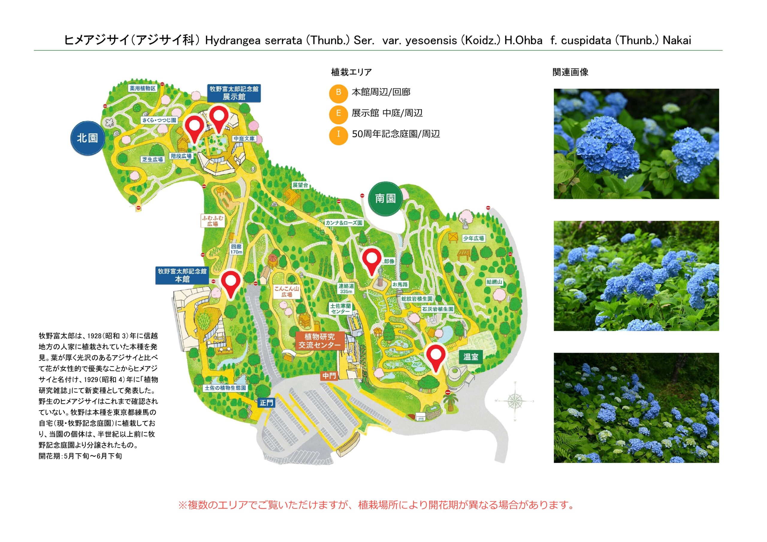 摘要 牧野富太郎は、1928(昭和 3)年に信越地方の人家に植栽されていた本種を発見。葉が厚く光沢のあるアジサイに比べて花が女性的で優美なことからヒメアジサイと名付け、1929(昭和 4)年に「植物研究雑誌」にて新変種として発表した。野生のヒメアジサイはこれまで確認されていない。牧野は本種を東京都練馬の自宅(現・牧野記念庭園)に植栽しており、当園の個体は、半世紀以上前に牧野記念庭園より分譲されたもの。