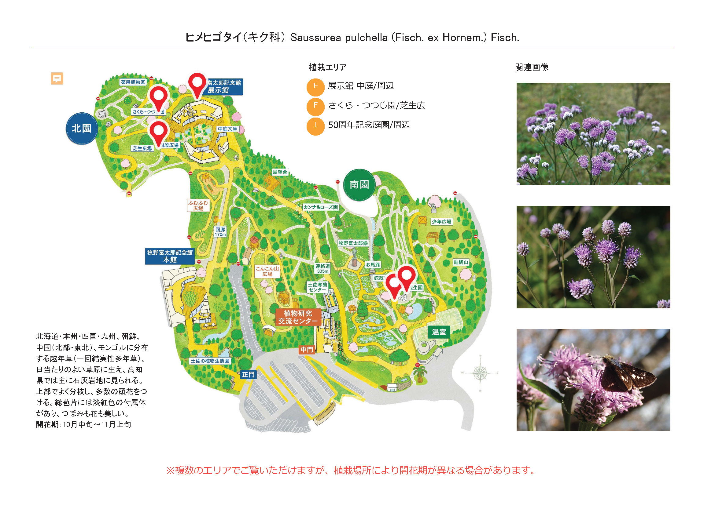 | 植栽エリア | E展示館 中庭/周辺 Fさくら・つつじ園/芝生広場周辺 I50周年記念庭園/周辺 |
