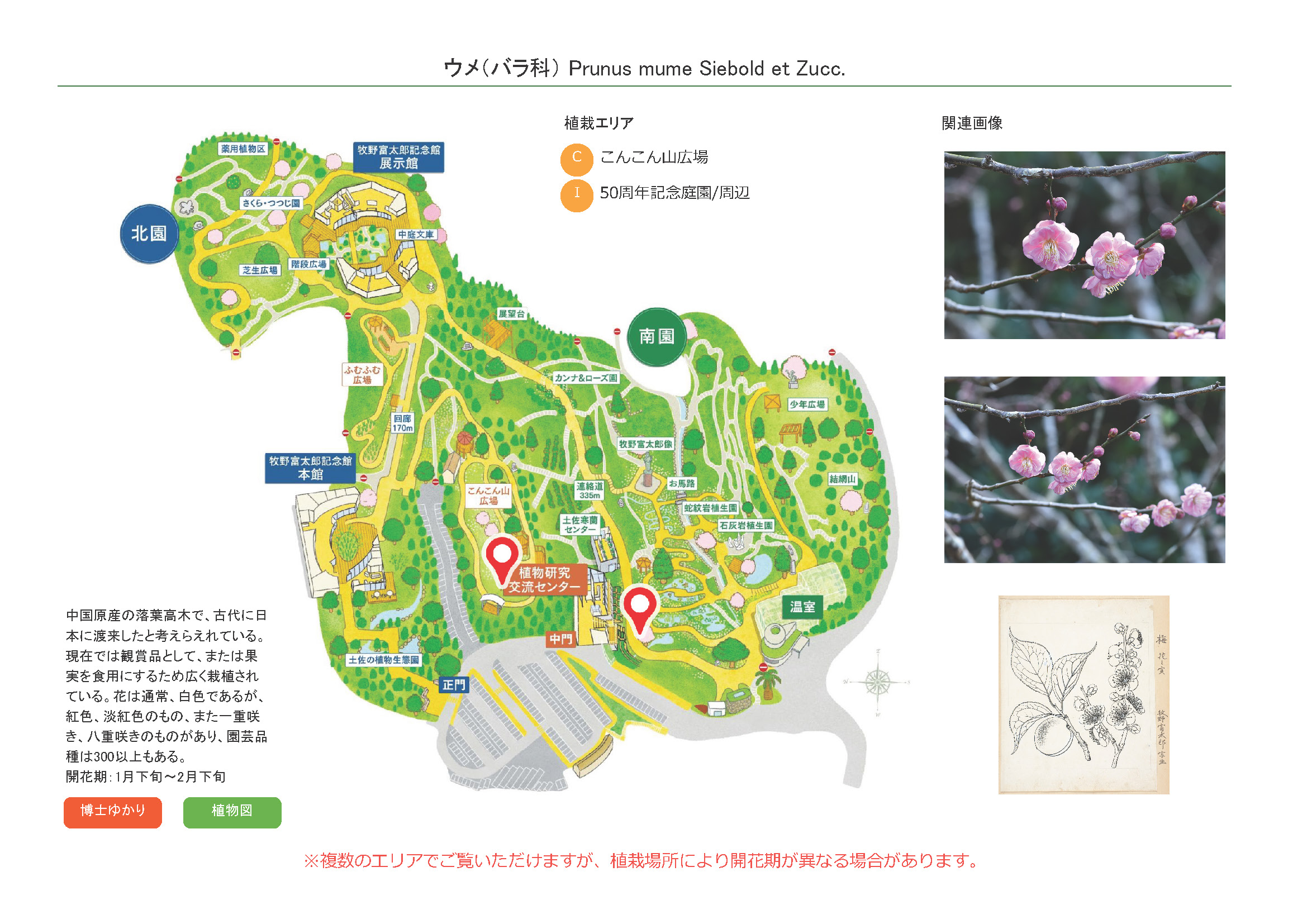 2024-10-11 / 最終更新日 : 2026-02-26 広報課 植物図 ウメ(バラ科) 描画者:牧野富太郎 材質:ケント紙 技法:墨 出典:「植物ノ知識ト趣味」(植物研究雑誌改題)第3巻第1号(1923)および「植物研究雑誌」(復題再発行)第3巻第1号(1926)挿図 種別:原図 描画者:牧野富太郎か 材質:ケント紙 技法:墨 彩色 月:7月 描画者:未詳 描画者:牧野富太郎 出典:白井光太郎, 大津源三郎 編『植物学教程』陸軍中央幼年学校(1903) 種別:校正図 種名ウメ 科名バラ科 別名- 学名Prunus mume Siebold et Zucc. 摘要 中国原産の落葉高木で、古代に日本に渡来したと考えらえれている。現在では観賞品として、または果実を食用にするため広く栽植されている。花は通常、白色であるが、紅色、淡紅色のもの、また一重咲き、八重咲きのものがあり、園芸品種は300以上もある。 さらに詳しく① さらに詳しく② 植栽エリア Cこんこん山広場 I50周年記念庭園/周辺 開花期 1月下旬〜2月下旬 見ごろ 博士ゆかり ○ 植物図 ○ 園内で見られる同じ科の植物 アメリカザイフリボク アンズ イザヨイバラ イヌリンゴ ‘アルプス乙女’ イワガサ ウメ‘呉服枝垂' ウメ‘鹿児島紅’ ウメの園芸品種 さらに表示