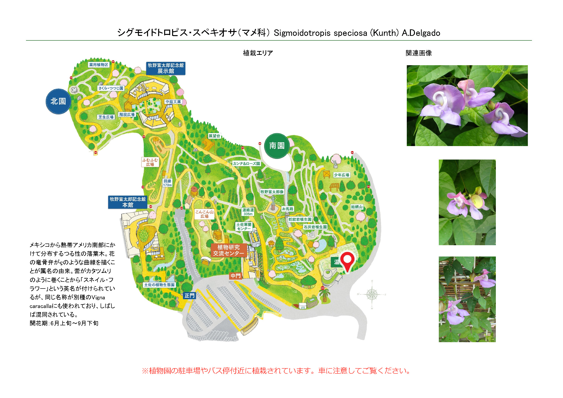 2025-01-20 / 最終更新日 : 2025-12-24 広報課 シグモイドトロピス・スペキオサ(マメ科) 種名シグモイドトロピス・スペキオサ 科名マメ科 別名- 学名Sigmoidotropis speciosa (Kunth) A.Delgado 摘要 メキシコから熱帯アメリカ南部にかけて分布するつる性の落葉木。花の竜骨弁がςのような曲線を描くことが属名の由来。蕾がカタツムリのように巻くことから「スネイル・フラワー」という英名が付けられているが、同じ名称が別種のVigna caracallaにも使われており、しばしば混同されている。 さらに詳しく① さらに詳しく② 植栽エリア 開花期 6月上旬〜9月下旬 見ごろ 博士ゆかり 植物図 園内で見られる同じ科の植物 アカシア・スペクタビリス アムヘルスティア・ノビリス イヌハギ ウンナンハギ エビスグサ オオベニゴウカン オジギソウ カワラケツメイ さらに表示
