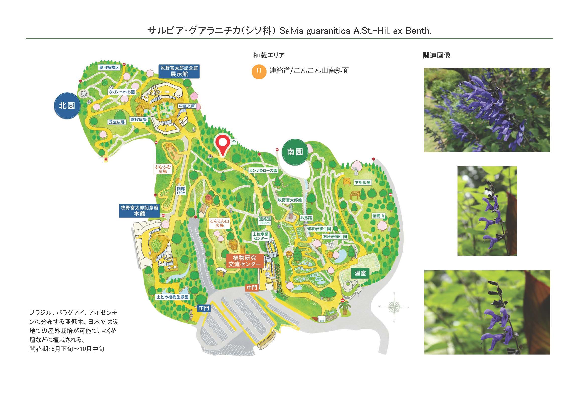 2025-01-20 / 最終更新日 : 2025-12-04 牧野植物園広報課管理 サルビア・グアラニチカ(シソ科) 種名サルビア・グアラニチカ 科名シソ科 別名ガラニチカセージ 学名Salvia guaranitica A.St.-Hil. ex Benth. 摘要 ブラジル、パラグアイ、アルゼンチンに分布する亜低木。日本では暖地での屋外栽培が可能で、よく花壇などに植栽される。 さらに詳しく① さらに詳しく② 植栽エリア H連絡道/こんこん山南斜面 開花期 5月下旬〜10月中旬 見ごろ ○ 博士ゆかり 植物図 同じ科名の園内植物 アキギリ アキチョウジ アキノタムラソウ アキノベニバナサルビア イヌコウジュ イブキジャコウソウ ウツボグサ オオマルバノテンニンソウ さらに表示