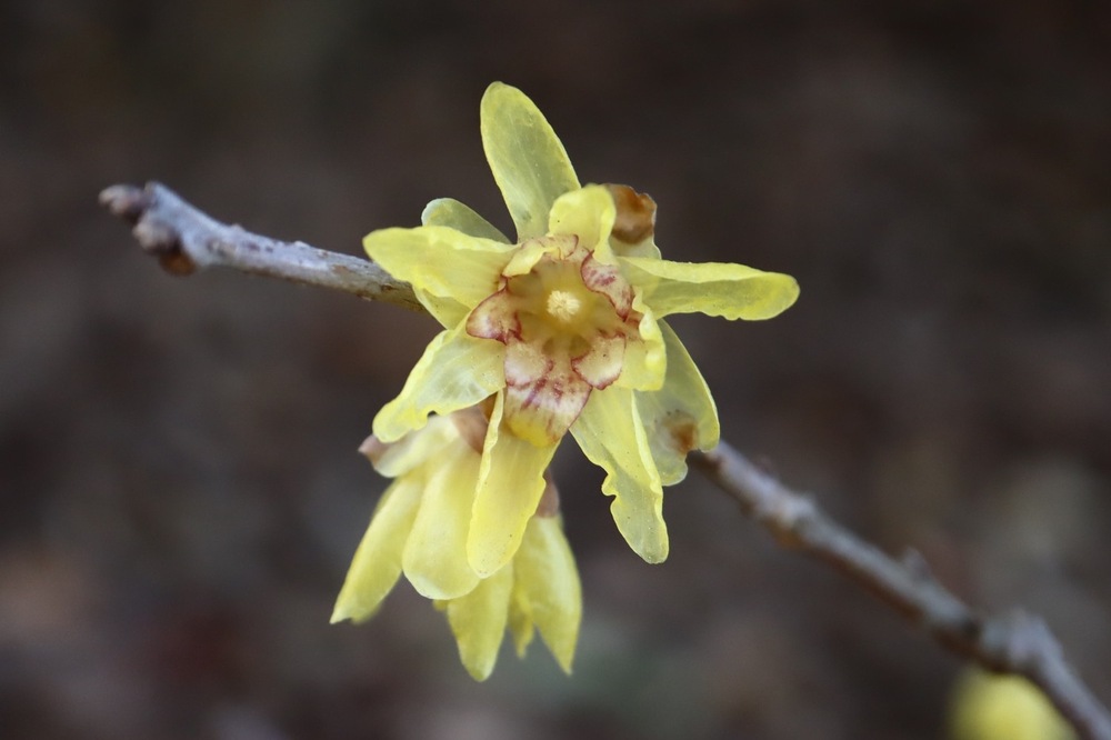 ソシンロウバイの花が咲き始めました。花の内側の一部がやや赤みがかっている