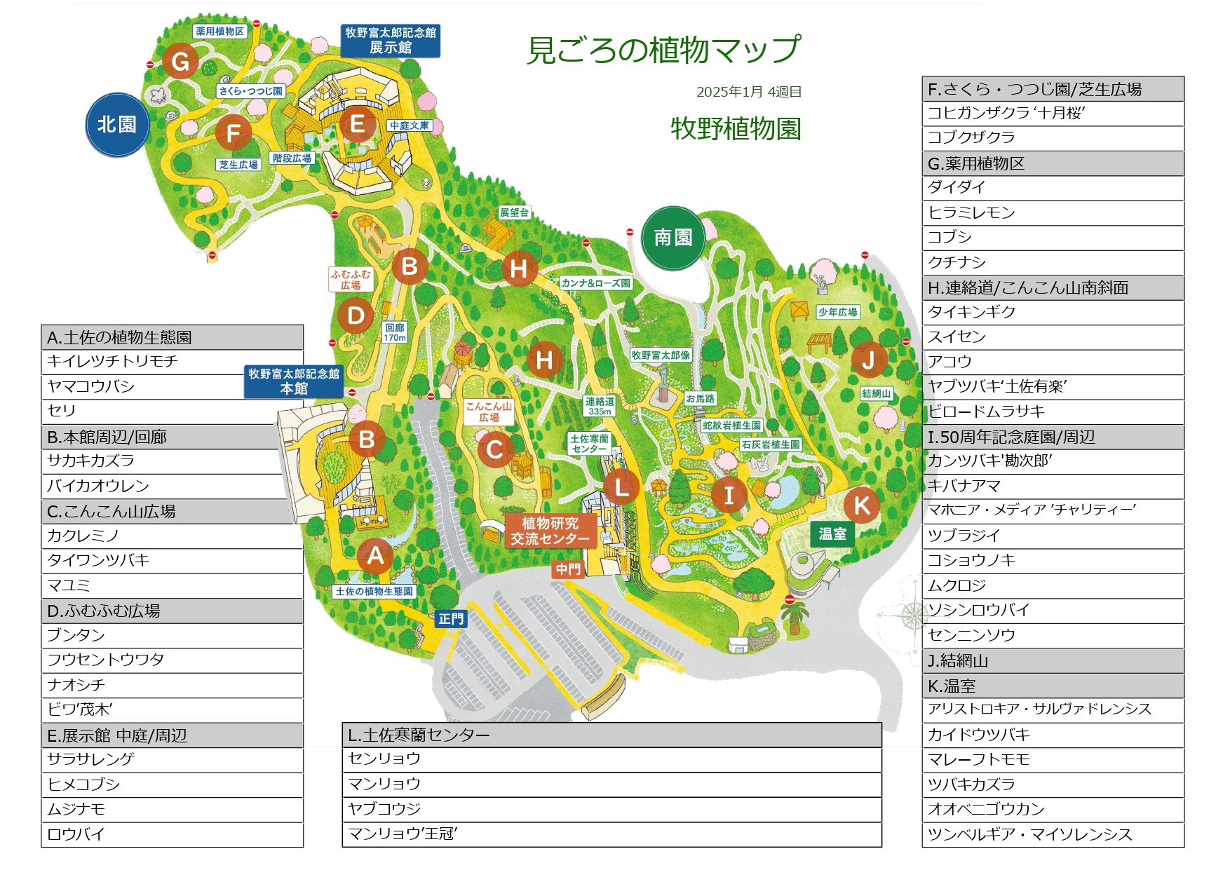 それではガイドが園内をくまなく歩き、調べた見ごろの植物をお届けします。