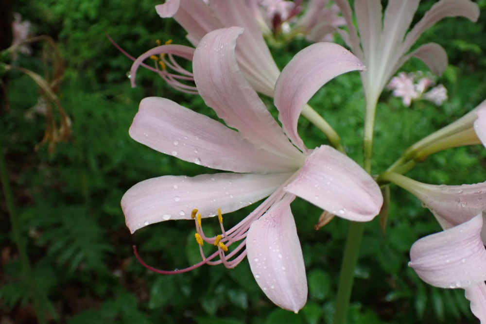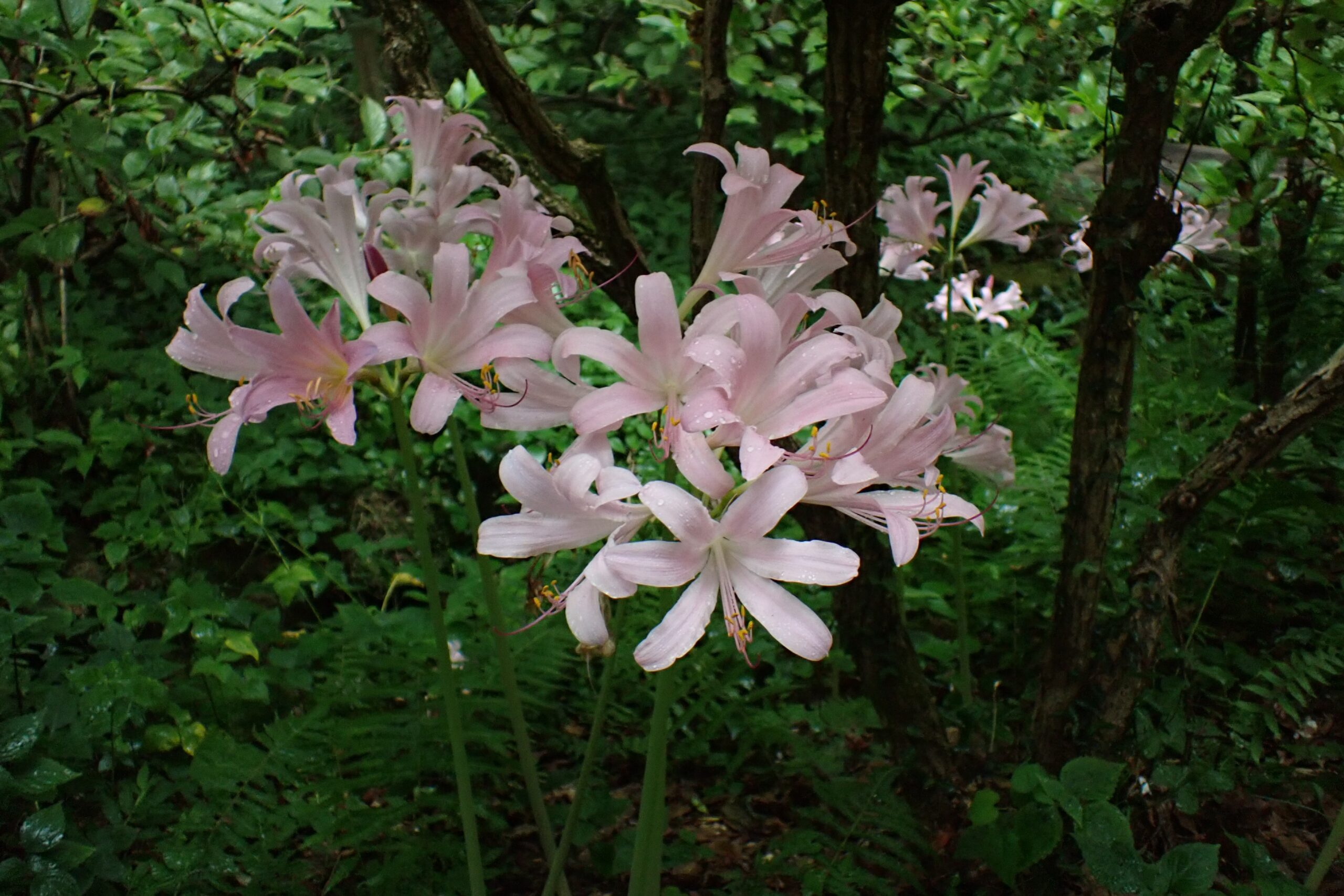 北園の芝生広場を下った先や、南園の結網山のふもとで見ごろです。本種は古い時代に中国から渡来したとされています。花が美しいため観賞用として人家などで栽培され、ときに逸出し、人里などでしばしば野生化しています。早春に伸びた葉は初夏に枯れ、その後、50~70cmの花茎が立って数個の淡紅紫色の花が咲きます。リコリス・ロンギツバ(Lycoris longituba)と