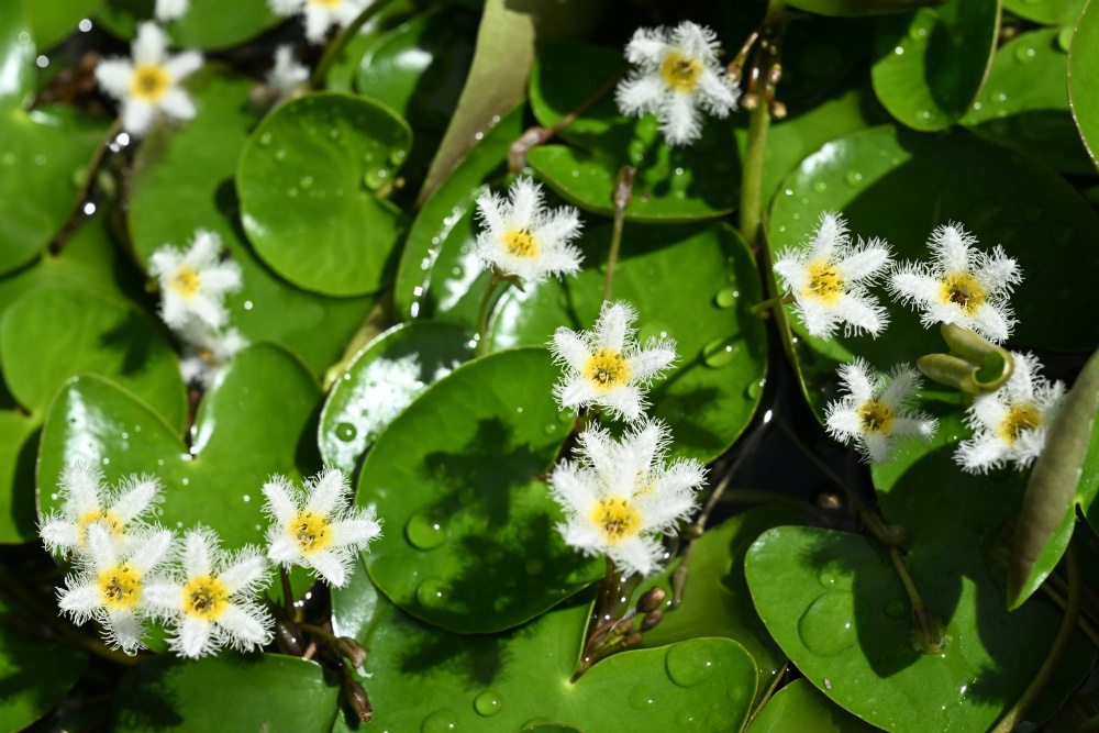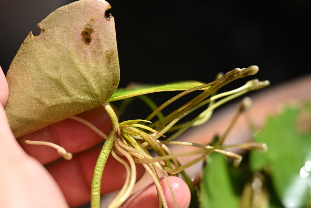 同じ種類でも株によってめしべの長さが異なる花を持つことを異花柱花性といい、本種も2つのタイプの花(短花柱花、長花柱花)を持ちますが、花を見るに当園の展示株は短花柱花株(めしべがおしべよりも短いタイプの花をもつ株)のようです。異花柱花性は本種以外にもサクラソウやアカネ科、モクセイ科などで見られ(関連:ミソハギの異花柱花性を紹介した8/1のブログ)、一般に同じタイプ同士の花では結実しにくく、自家受粉を避ける工夫と考えられています。一方で、本種は殖芽による無性生殖も行います。丸い葉を裏返してみると、葉柄の基部にバナナの房のように肥大した殖芽が観察できます。多様な繁殖様式を持つことは生存競争に有利に働きそうですが、そもそも自生環境の池沼は埋め立てられることも多く、環境省レッドリスト(2020)では準絶滅危惧(NT)に、高知県レッドデータブック(2022)では絶滅危惧IA類(CR)にそれぞれ指定され、東京都、神奈川県、福井県、鳥取県では既に絶滅したとされています。