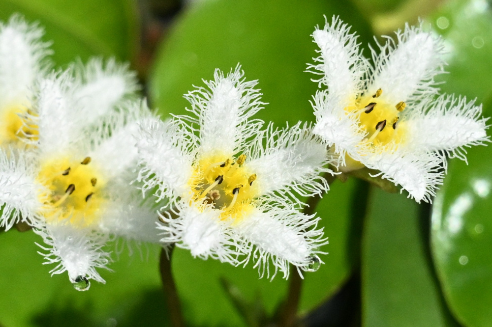 南園のスイレンがある池(5号池)の東側、道沿いに置いた水がめの中に植えています。園地で公開されているものはこの展示のみなので、花が終わって片づける前にご覧ください。ガガブタは本州から九州のほか、国外では朝鮮半島、中国、東南アジア、アフリカ、オーストラリアなど熱帯から暖帯に広く分布する多年生の水生植物で、池沼に生え、スイレンによく似た円形の葉を水面に浮かべます。花は白色で中心部は黄色、5つに分かれた裂片のふちは長い毛が密生し、愛らしい姿をしています。