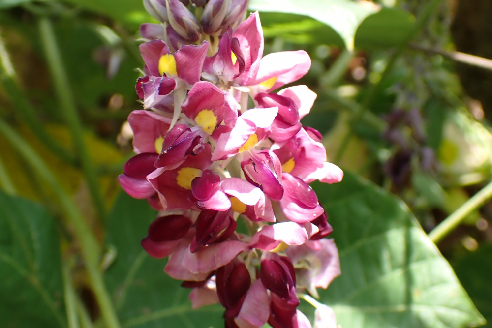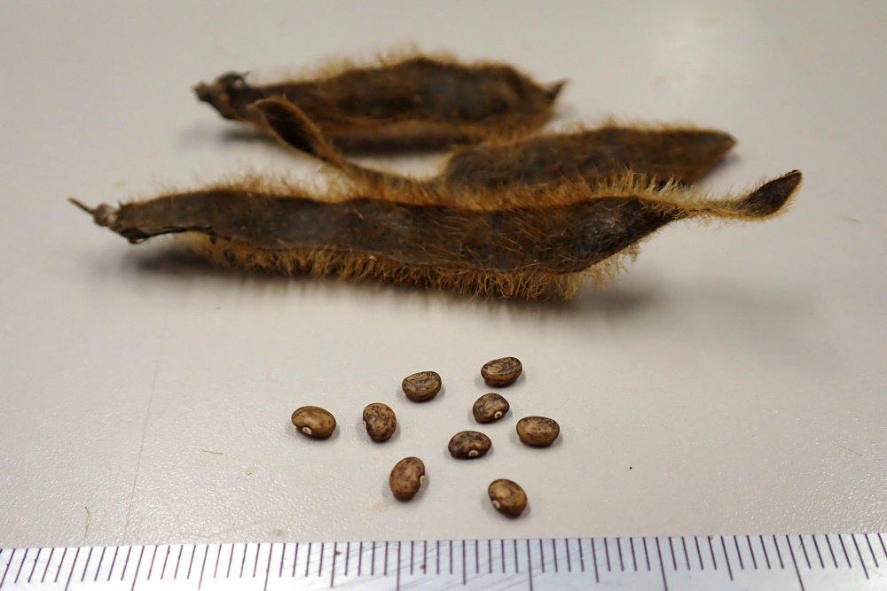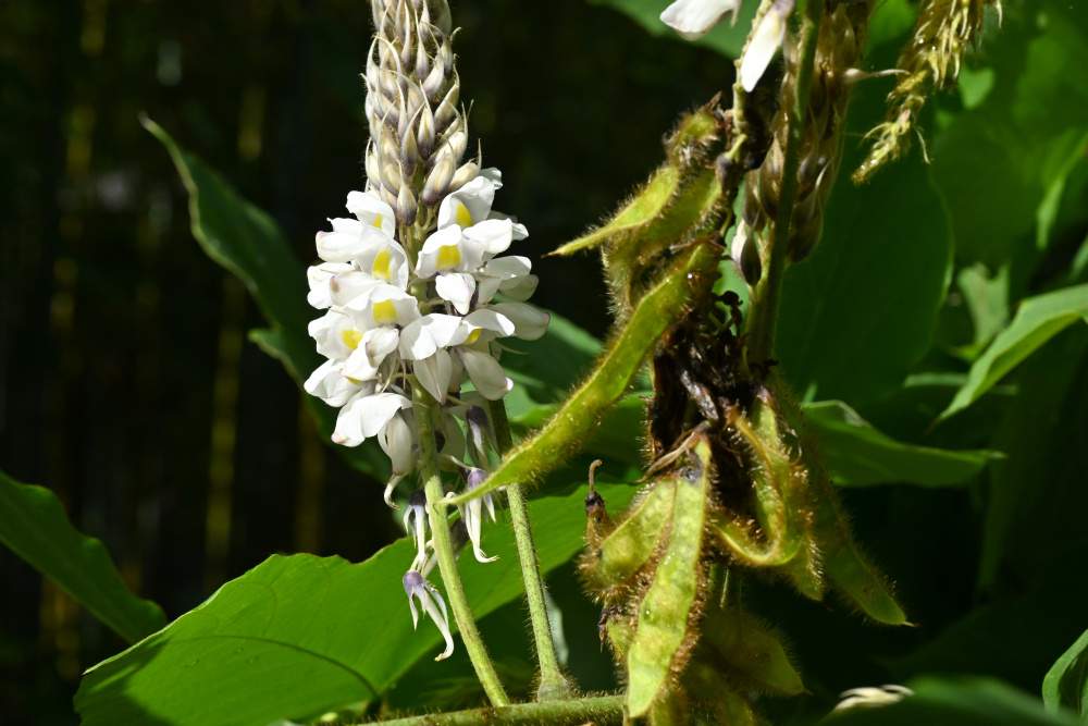 当園では6月下旬から7月中旬にかけてと、8月下旬から9月中旬にかけての年2回、開花のピークがあり、現在は未熟な果実と一緒に花を楽しむことができます。マメ科である本種の果実は褐色の粗い毛におおわれており、未熟な果実は中身がない‘スカスカ’の枝豆のように見えます。