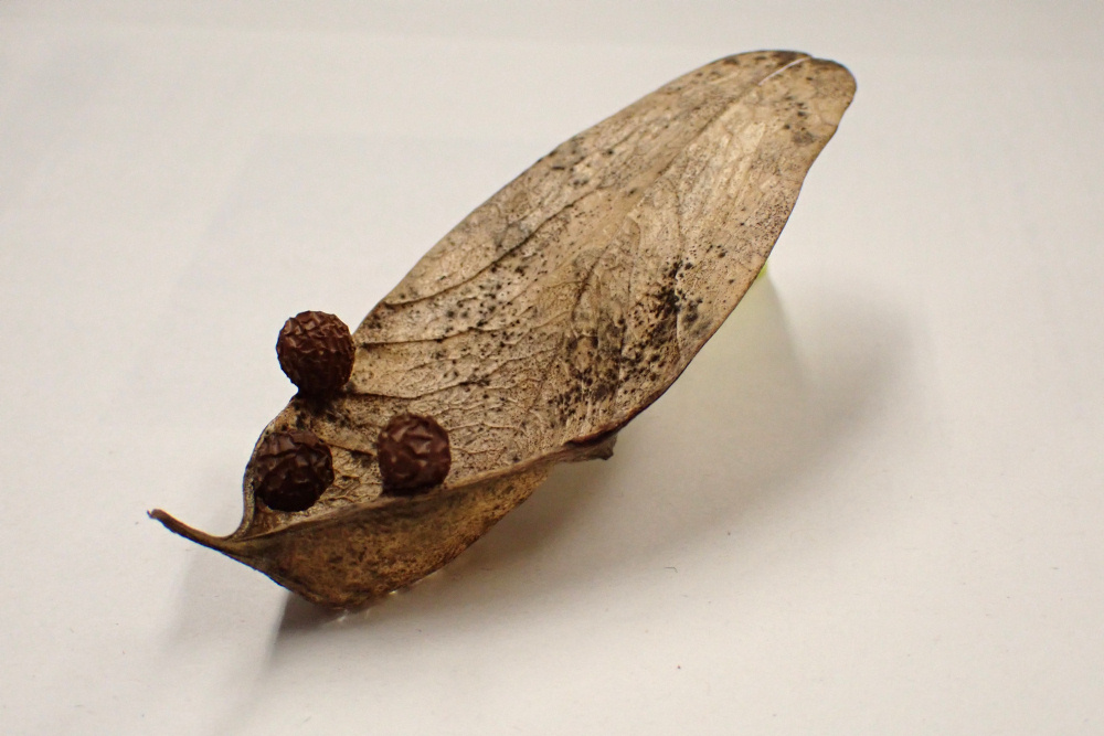 見上げると観察できる、枯れた葉のように見えるのが果実(分果)。