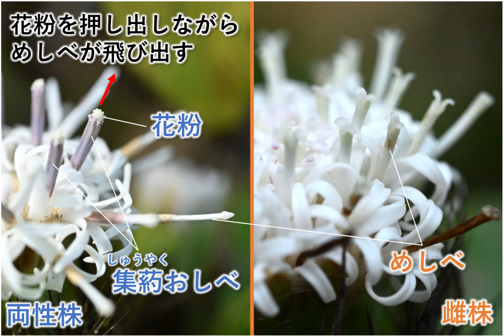 本種はおしべとめしべが一つの小花に同居する両性花をもつ両性株と、めしべのみからなる雌花をもつ雌株があります。両性花は集葯おしべと呼ばれる葯どうしが合着し、筒状になったおしべの中を突き抜けるようにめしべが伸長し、花粉を押し出します。自身の花粉では結実せず(自家不和合性)、アブやハエなどの訪花昆虫が他の株の花粉を届けて受粉を促します。ぜひ見比べてみてください。