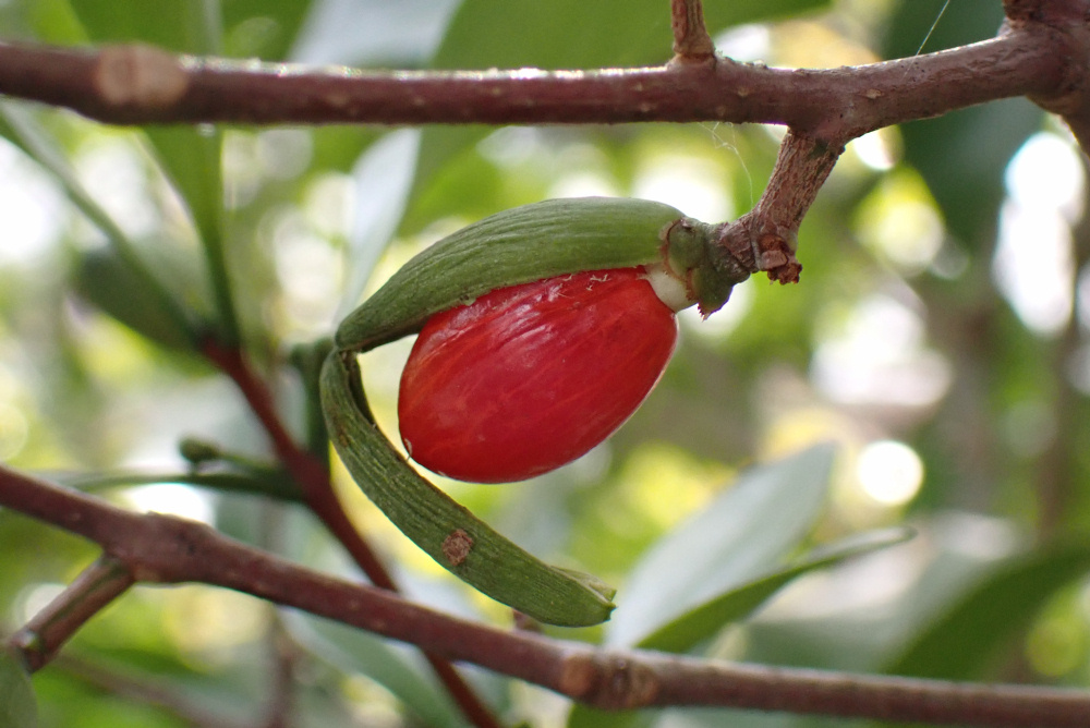 展示館の中庭にて、緑色の果皮が割れ、赤い仮種皮が目立つ本種の種子がご覧いただけます。本種は暖地に生育する常緑低木で、分布が面白く、国内では本州(房総、神奈川、伊豆)と九州(南部、五島列島)、沖縄と、とびとびに分布(隔離分布)します。本種は雌雄異株といって我々人と同様に性別があり、雄株は雄花のみを、雌株は雌花のみを咲かせます。つまり、果実が実っているのは雌株だけ。雄株、雌株ともに蕾もあり、花も近いうちに咲きそうです。和名は木本である本種の種子が、ツルレイシ(ニガウリ、流通名:ゴーヤ)の果実が熟すと露出する、赤色の仮種皮を持った種子に似ていることから名付けられたとする説があります。