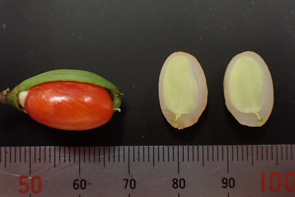 赤い仮種皮は粘りがあり、若干の青臭い香りがしました。同じニシキギ科のニシキギツルウメモドキなどは赤色の仮種皮ごと鳥に食べられて種子が運ばれ(被食散布)ますが、種子の大きさが1.5センチほどある本種はどうでしょうか。種子をナイフで切ると断面の大きさに近いくらい大きな2枚の子葉が収まっていました。