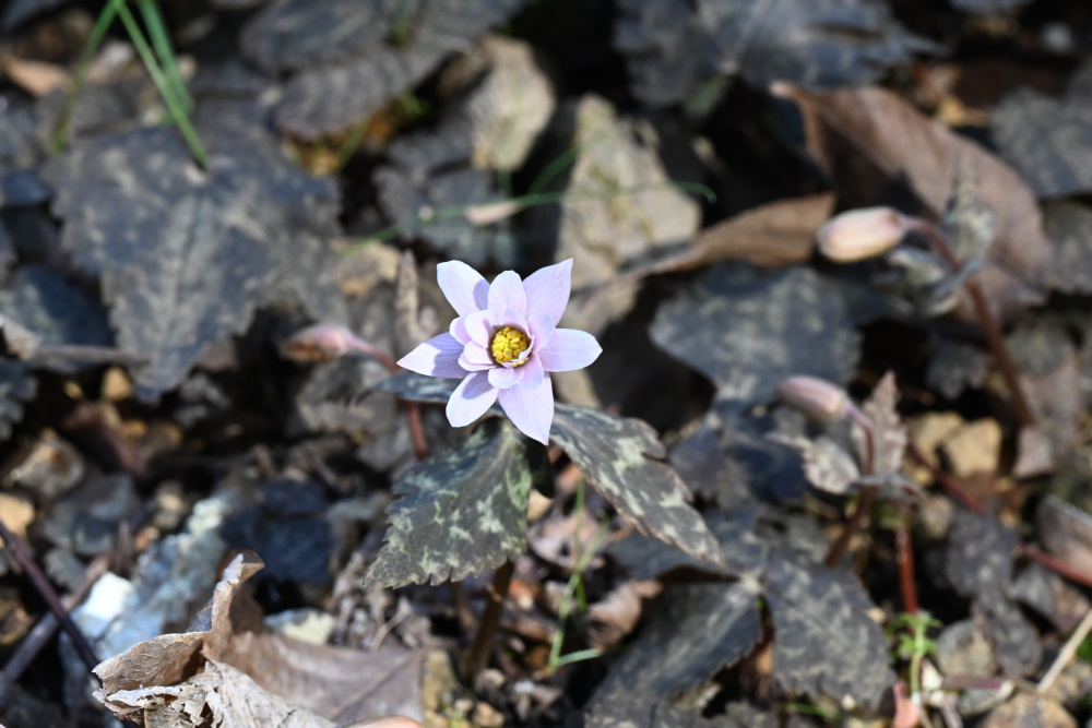 ユキワリイチゲは本州(近畿地方以西)・四国・九州に分布し、雑木林の林縁や林床に生える多年草です。早春のこの時期に花を咲かせますが、花弁状のものは萼片が発達したもので、株により淡紫色や淡桃色と、花色には幅があります。木々が落葉し地表までよく陽が当たる秋から初冬にかけて葉を展開し、木々の葉が生い茂って地表が暗くなる夏には地上部を枯らして長い休眠に入ります(そのような生活様式をもつ植物のことをスプリング・エフェメラル(春の妖精、春植物)とよびます)。