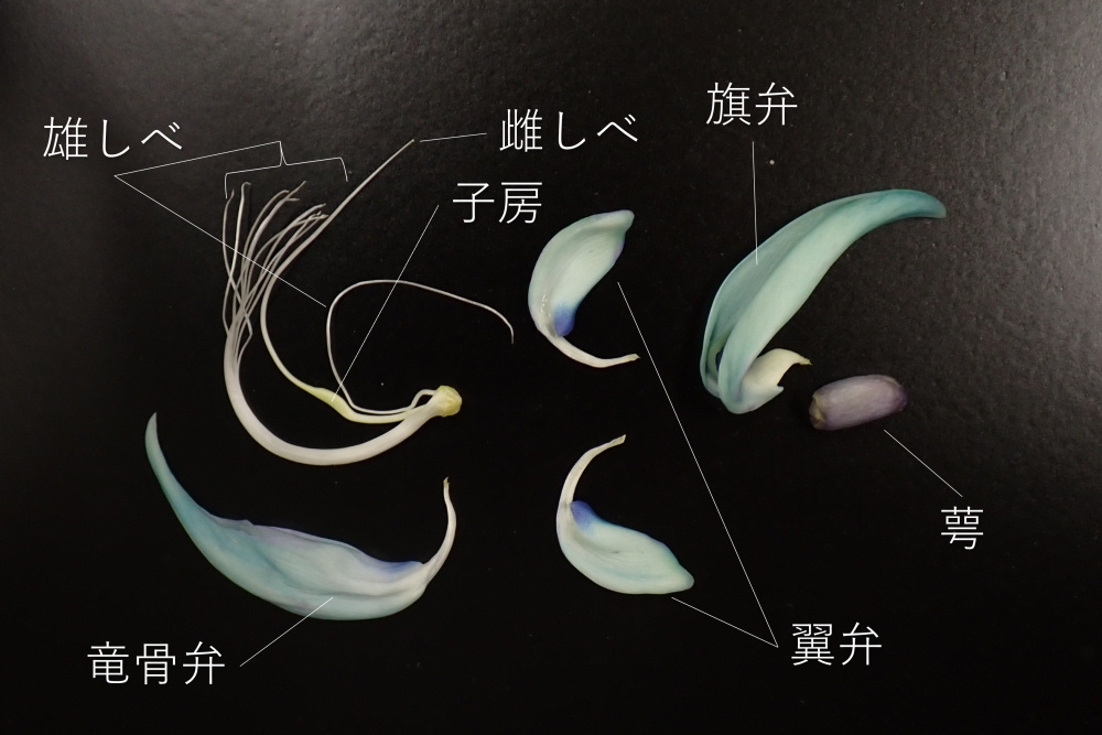 せっかくなので、花の解剖も行ってみました。ほかの多くのマメ科植物と同様「蝶形花」で、5枚の花弁は、1枚の旗弁と2枚の翼弁、合着した2枚の竜骨弁からなります。竜骨弁に沿うように1本の雌しべと10本の雄しべがあり、10本の雄しべのうち9本は基部から中ほどまで合着して丈夫なさや状になっています。竜骨弁や翼弁の基部は細く糸状でオオコウモリが頭を突っ込むと容易に押し広げられ、丈夫なさや状の雄しべとそれに包まれた雌しべが飛び出す寸法のようです。