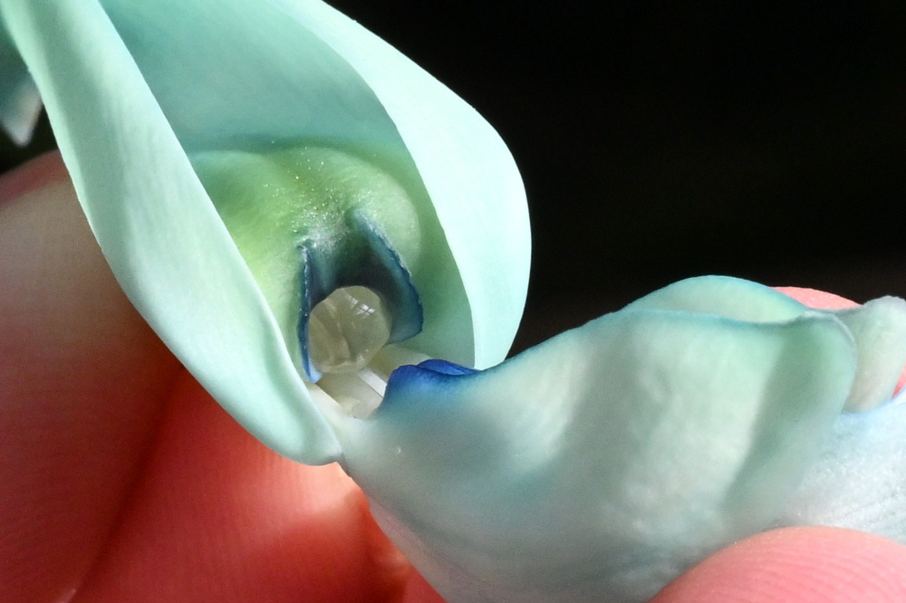 オオコウモリがヒスイカズラの花に頭を突っ込んで蜜を舐めるとどうなるか、動画を撮ってみました。オオコウモリの代わりに指し棒を押し込むと竜骨弁の先から雄しべ(と雌しべ)が飛び出し、花粉がこぼれます。多すぎず、少なすぎない、絶妙な量の蜜がオオコウモリを引き寄せ、花粉の運び屋に仕立て上げます。