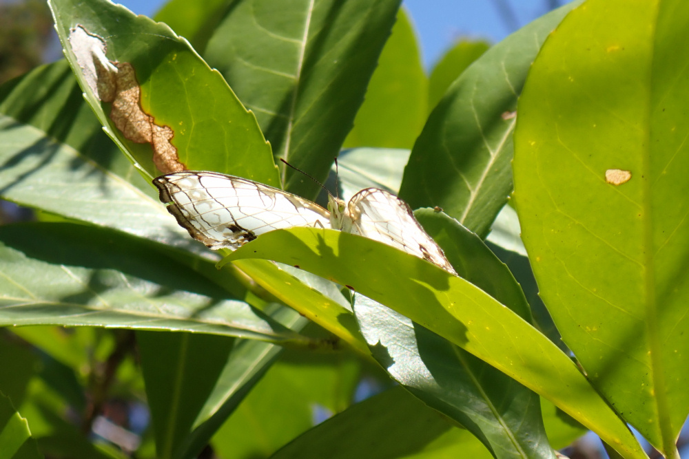 セイヨウバクチノキの葉の上で縄張りを監視するイシガケチョウ