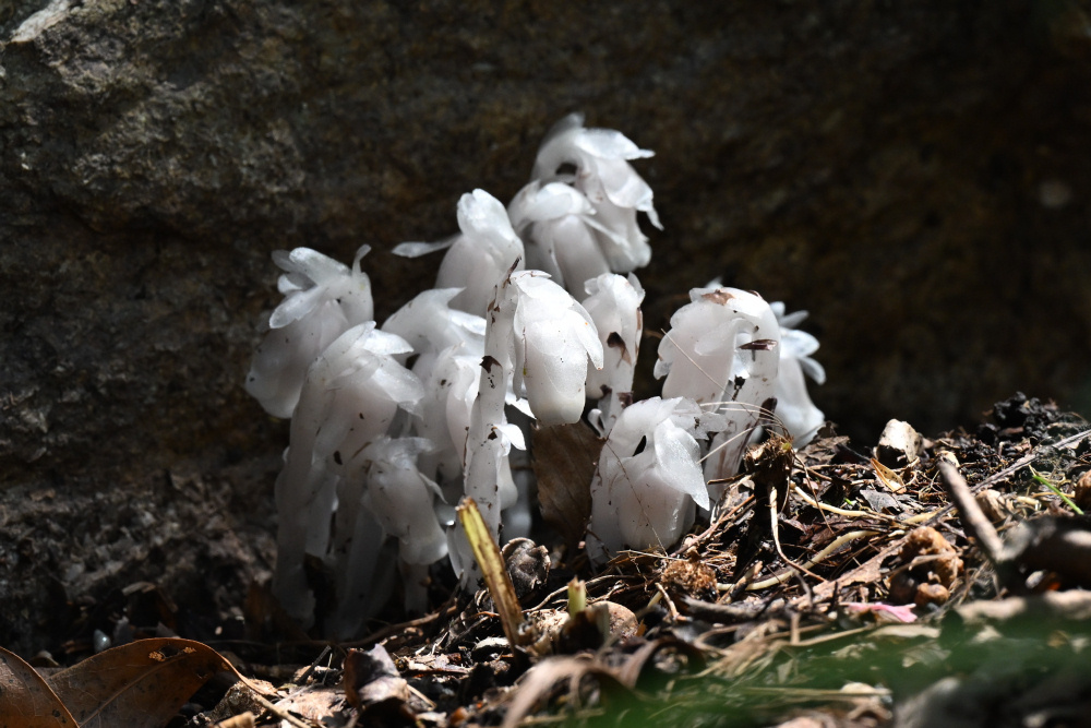 土佐の植物生態園でご覧いただけます。本種は北海道~琉球のほか、国外ではサハリン、朝鮮半島、中国、台湾、ミャンマー、インド北部、ヒマラヤなど広く分布します。葉緑素を持たない全体が白色の多年草で、山地林内の湿り気のある腐植土の上に生え、そこに生育する菌類から養分を得て育ちます。