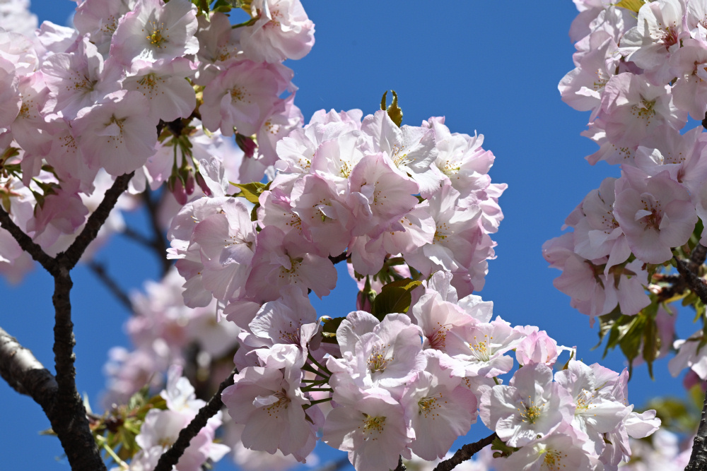 さくら・つつじ園に植栽があり、4/3現在、満開です。かつて東京の荒川堤に栽培されていたサトザクラの園芸品種で、後水尾天皇があまりの美しさに御車を返してご覧になったことにちなむという説と、一重が八重かで言い争いになった人が車を引き返させて確かめたという説があります。