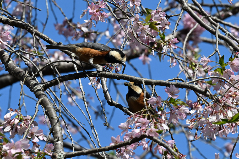 エドヒガン‘紅枝垂’につく虫を食べるヤマガラ