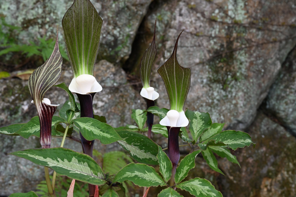 花はふつう淡紅紫色ですが、白花を咲かせるこの株は当園の園長であった山脇哲臣氏が四万十市下田で発見したもので、結網山の山頂近く(ピークから見える竹林寺・五重塔側へ少し下ったところ)で見ごろをむかえています。