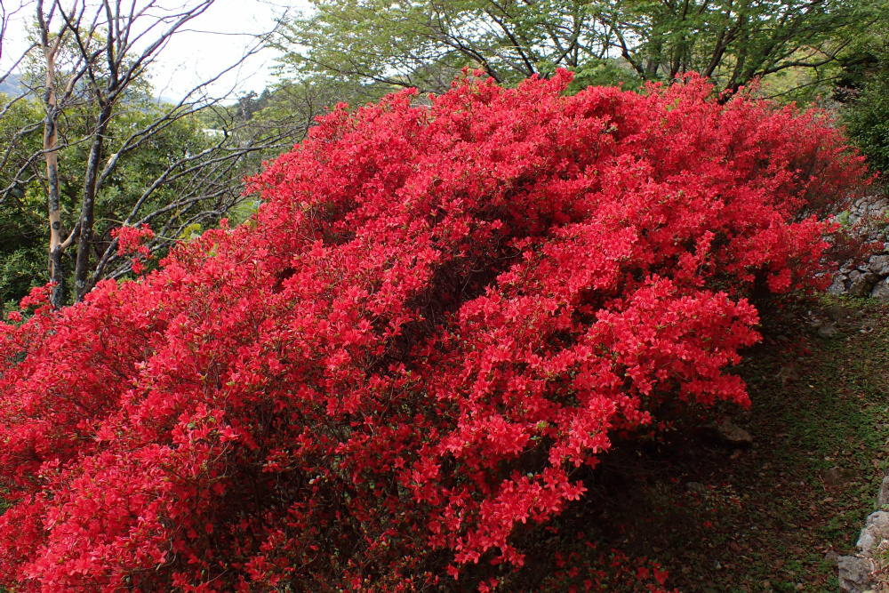 混混山南斜面と、南園のお馬路と蛇紋岩植生園に植栽があります。本種は鹿児島県の大隅半島や薩摩半島に分布するサタツツジをもとに作出された園芸品種とされています。その中でも、南園のお馬路と蛇紋岩植生園には江戸で「霧島」とよばれて大流行したものの現在ではほとんど見られなくなった貴重な園芸品種である‘本霧島’が植栽されており、4/10現在、見ごろ真っ盛り。江戸の人々を魅了した、燃えるような濃赤色の花が楽しめます。