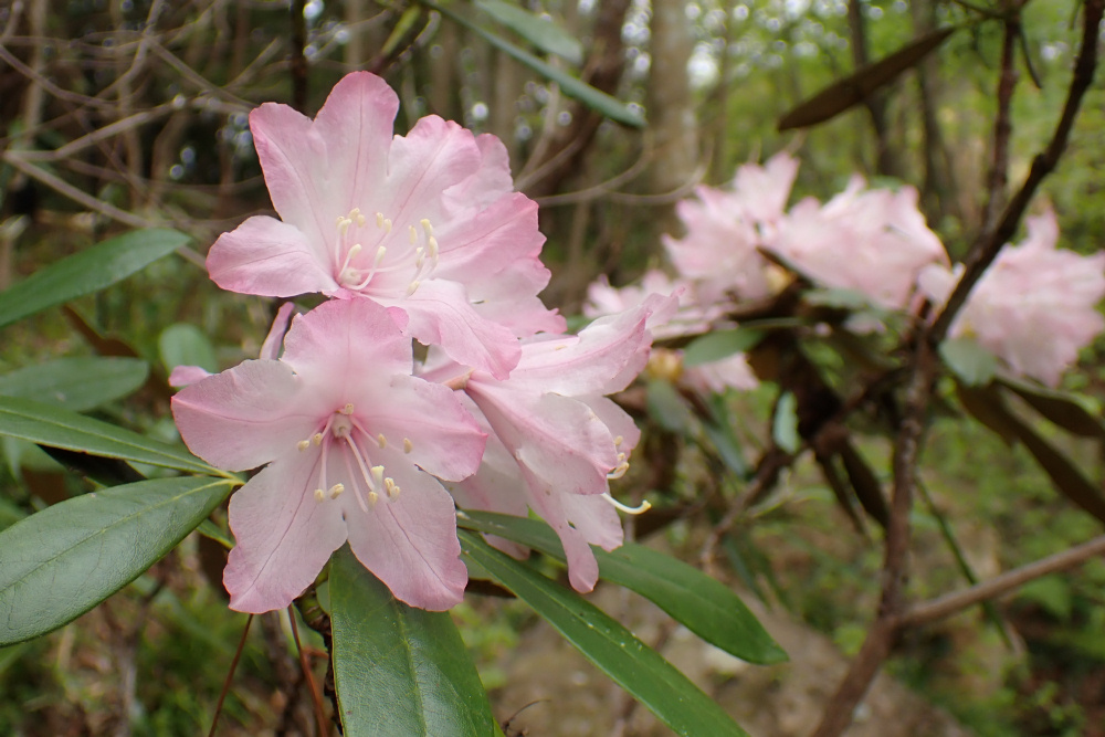 結網山に数株が植栽されています。本州(新潟県以西)・四国(中北部)に分布し、ツクシシャクナゲと同様、深山の尾根沿いなどに生育します。基本種のツクシシャクナゲと葉の裏面を見比べると、平たいロゼット状毛が密着していて、ツクシシャクナゲのように毛が密生しているようには見えません。4/10現在、開花は最盛期で蕾もあるので、この機会に結網山まで足を運んで観察を楽しんではいかがでしょう。