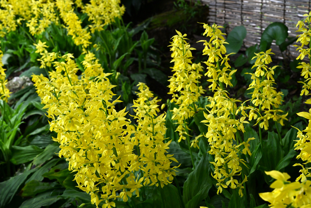 4/17現在、回廊で見ごろとなっています。本州(静岡県以西)・四国・九州、朝鮮(済州島)、台湾、中国(湖南省)に分布する常緑の多年草で、暖温帯の林床に生育します。エビネに似ていますが、エビネよりも全体に大型で花が黄色であり、唇弁の中裂片が2裂しない点が異なります。牧野博士は、著書(『牧野富太郎選集5』日本のえびねについて)のなかで「花色純黄にしてすこぶる美なり」とキエビネの美しさを讃えています。