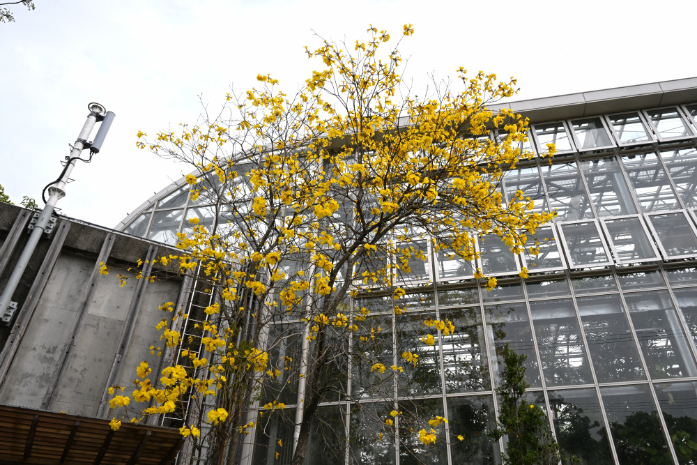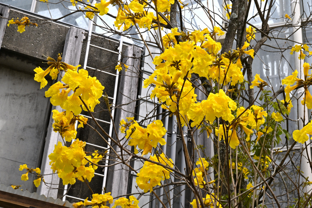 園外の、竹林寺前バス停そばでは、ブラジル~アルゼンチン(北東部)原産のキバナイペーが見ごろです。落葉期に濃い黄色の花を枝先に咲かせます。ご覧のように花が美しいことから、熱帯地域に広く花木として栽培されます。